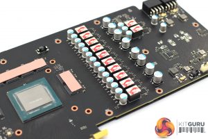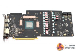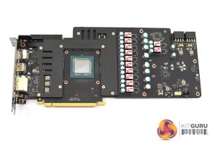 Taking the card apart, the first thing to note about the PCB is the metal frame which is screwed onto the left-hand portion of the board. This acts as a mini heatsink for the VRAM chips (it has thermal pads to contact with them) while it also provides some extra rigidity for the card. It screws into both the backplate and the I/O bracket.
