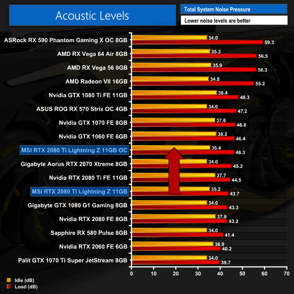 Lastly, it is again not surprising to see power consumption increase even further, with the whole system drawing almost 500W from the wall. The overclocked Lightning Z draws 130W more than a stock Founders Edition RTX 2080 Ti.