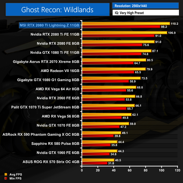 Ghost Recon: Wildlands continues the same trend we have seen from every benchmark so far – the Lightning 2080 Ti comes out on top across all three resolutions tested. It produces almost 70FPS at 4K, with a 2.9FPS lead over Nvidia's Founders 2080 Ti.