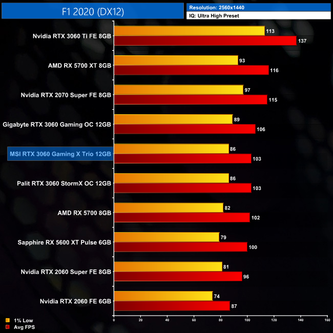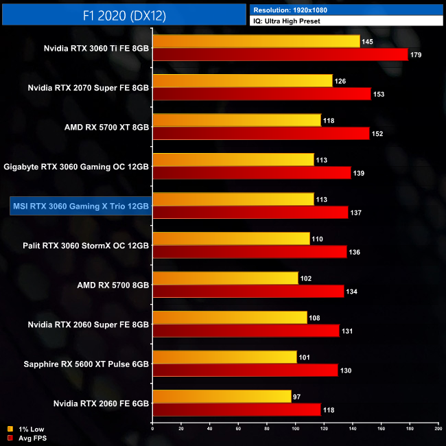 Next is F1 2020, where all three RTX 3060s in our chart sit within just 3 frames of each other. Considering the frame rate is north of 130FPS, I'd say the difference between any of the three cards would be impossible to notice.