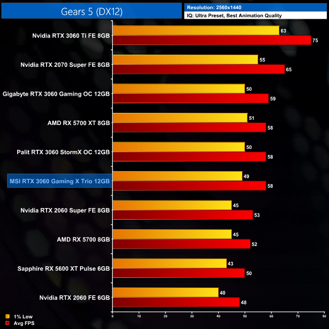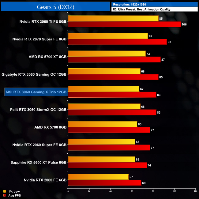 Coming onto Gears 5, here the Gaming X Trio hits 83FPS on average, just 2FPS slower than the Gigabyte Gaming OC. It's also a round 20% faster than the RTX 2060.