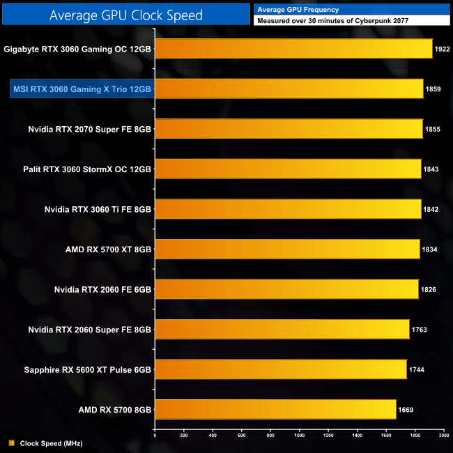 Here we present the average clock speed for each graphics card while running Cyberpunk 2077 for 30 minutes. We use GPU-Z to record the GPU core frequency during gameplay. We calculate the average core frequency during the 30 minute run to present here.