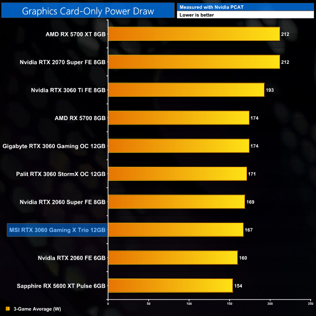We also use Nvidia PCAT to measure power draw of the graphics card only, with readings from both the PCIe slot and the PCIe power cables combined into a single figure. This provides us with significantly more accurate data to work with as it is measuring only the GPU power, and not total system power which is a fundamentally imprecise measurement.