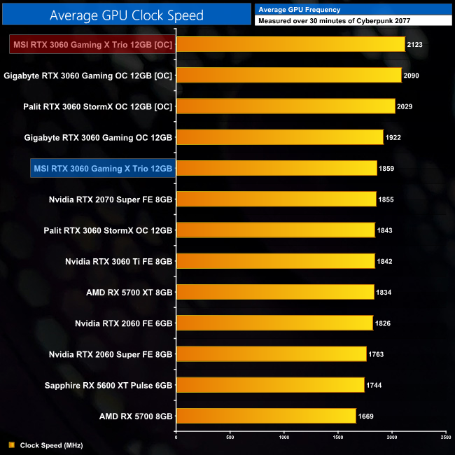 This brought average clock speed up to 2123MHz, which is a hugely impressive result, showing a 14% increase to average GPU frequency.