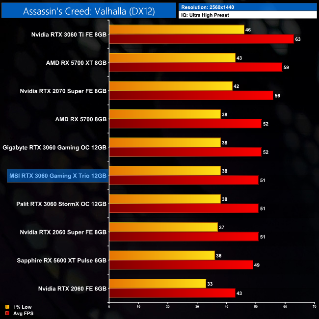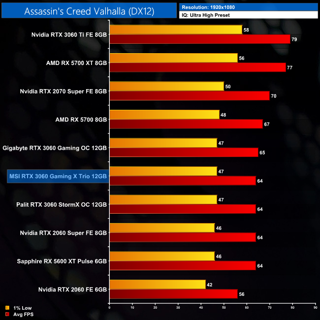 Assassin's Creed Valhalla sees the Gaming X Trio hit 64FPS on average at 1080p. That's 14% ahead of RTX 2060, and right around the same level as the other two RTX 3060s in our chart.