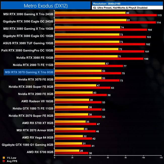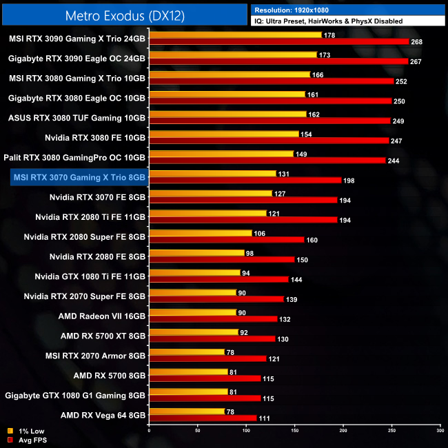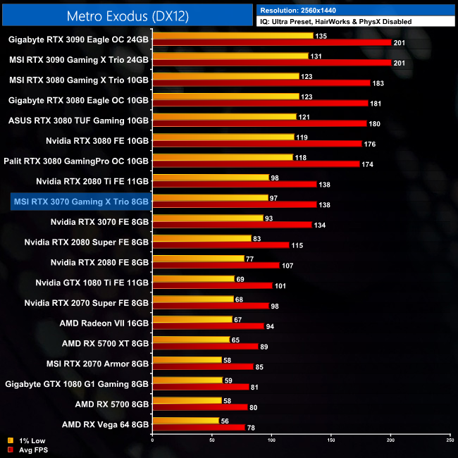 In Metro Exodus, the RTX 3070 Founders Edition averaged 134FPS at 1440p, and the MSI card increases this by 4FPS, or an extra 3%.