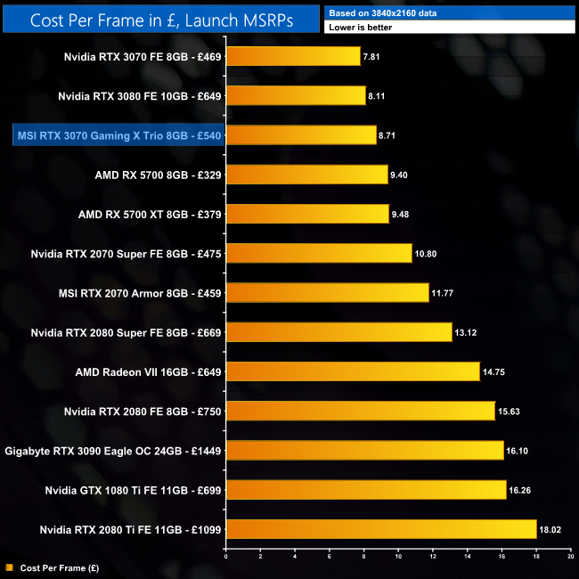 With a UK MSRP of £539.99, the overall value of this RTX 3070 isn't as strong as the Founders Edition, as each frame costs £0.90 more. Compared to RTX 3080, the difference is £0.60, but other than that the Gaming X Trio still offers better value than any other GPU currently available.