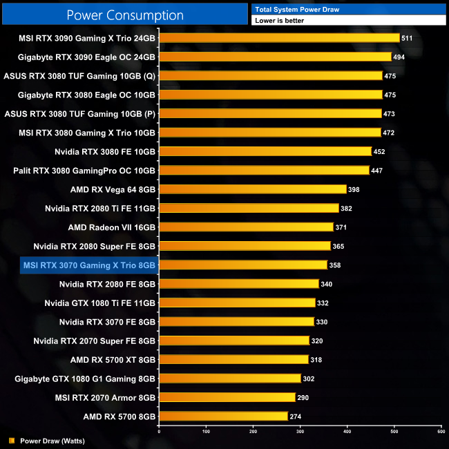 Total system power draw comes in about 30W higher than the RTX 3070 Founders Edition, so it is just shy of the RTX 2080 Super.