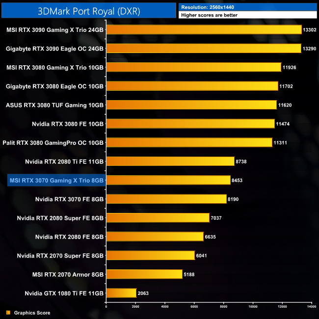In Port Royal, 3DMark's ray tracing benchmark, the MSI RTX 3070 takes a 3% lead over the Founders Edition.