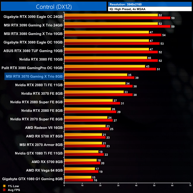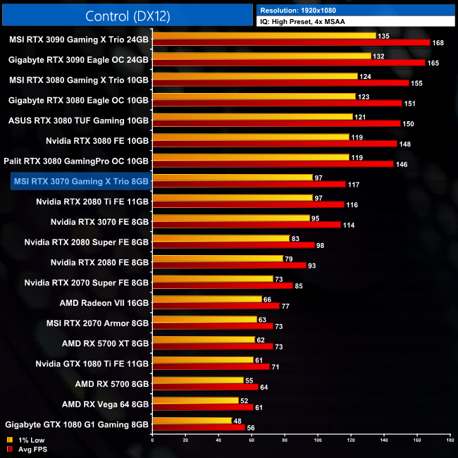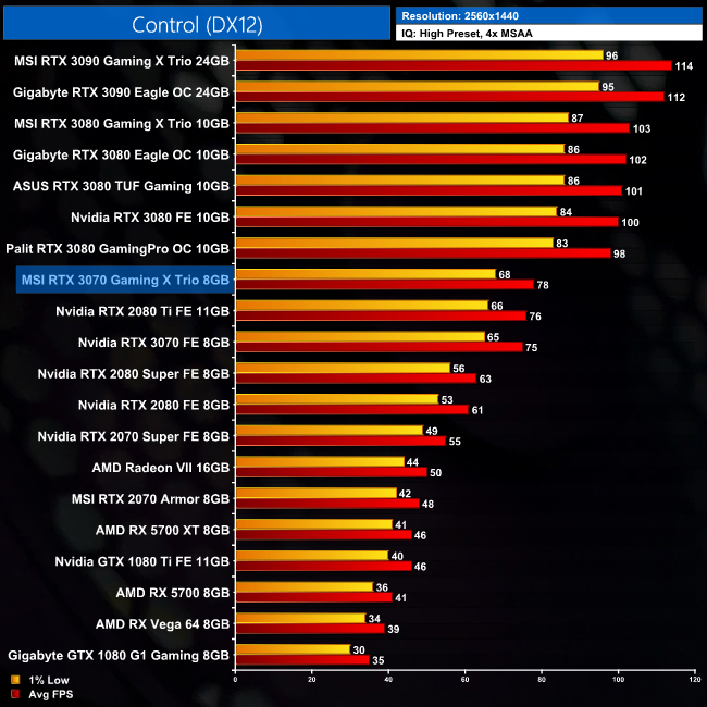 When looking at Remedy's Control, here the MSI RTX 3070 Gaming X Trio takes a 3FPS – or 4% – lead over the Nvidia Founders Edition at 1440p.