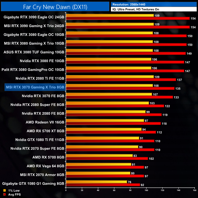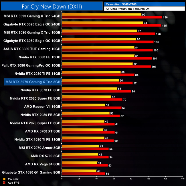 Far Cry New Dawn is fairly CPU limited at 1080p and even 1440p, but at 4K the Gaming X Trio pulls ahead of Nvidia's Founders Edition by 2FPS, or 3%.