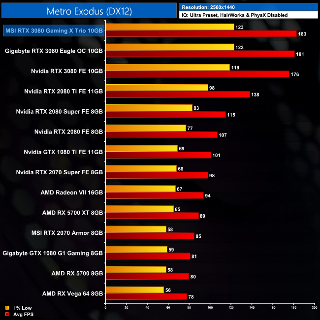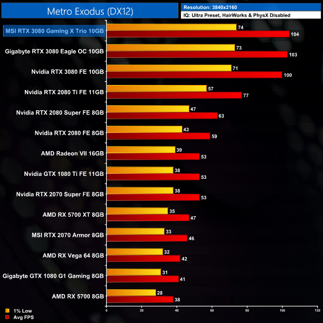 RTX 3080 chews through Metro Exodus, delivering over 100FPS even at 4K. The Gaming X Trio averages 104FPS at this resolution, which is both 4FPS and 4% better than the Nvidia Founders Edition.
