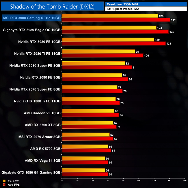 Just like Red Dead Redemption 2, the Gaming X Trio is 5% faster than the Founders Edition in Shadow of the Tomb Raider, when testing at 4K.