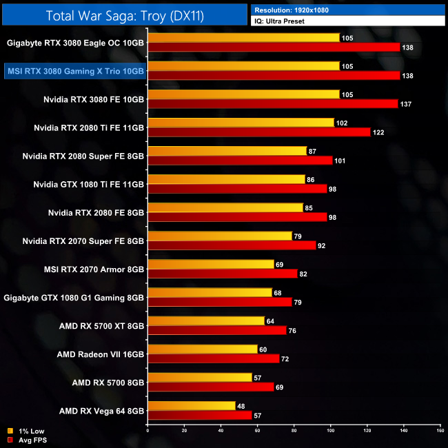 Total War Saga: Troy is the game that benefits least from the additional clock speed of the Gaming X Trio. It is just 1% faster than the Founders Edition at 1080p, but only 2% faster at 1440p and 4K.
