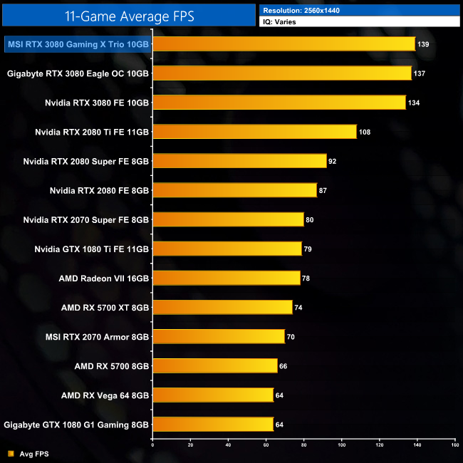 Based on the 11 games we looked at, it's no surprise to see the Gaming X Trio coming out as the overall performance leader, regardless of the resolution tested. It does show its biggest gains at 1440p and 4K, though, where it is on average 4% faster than the Nvidia Founders Edition.