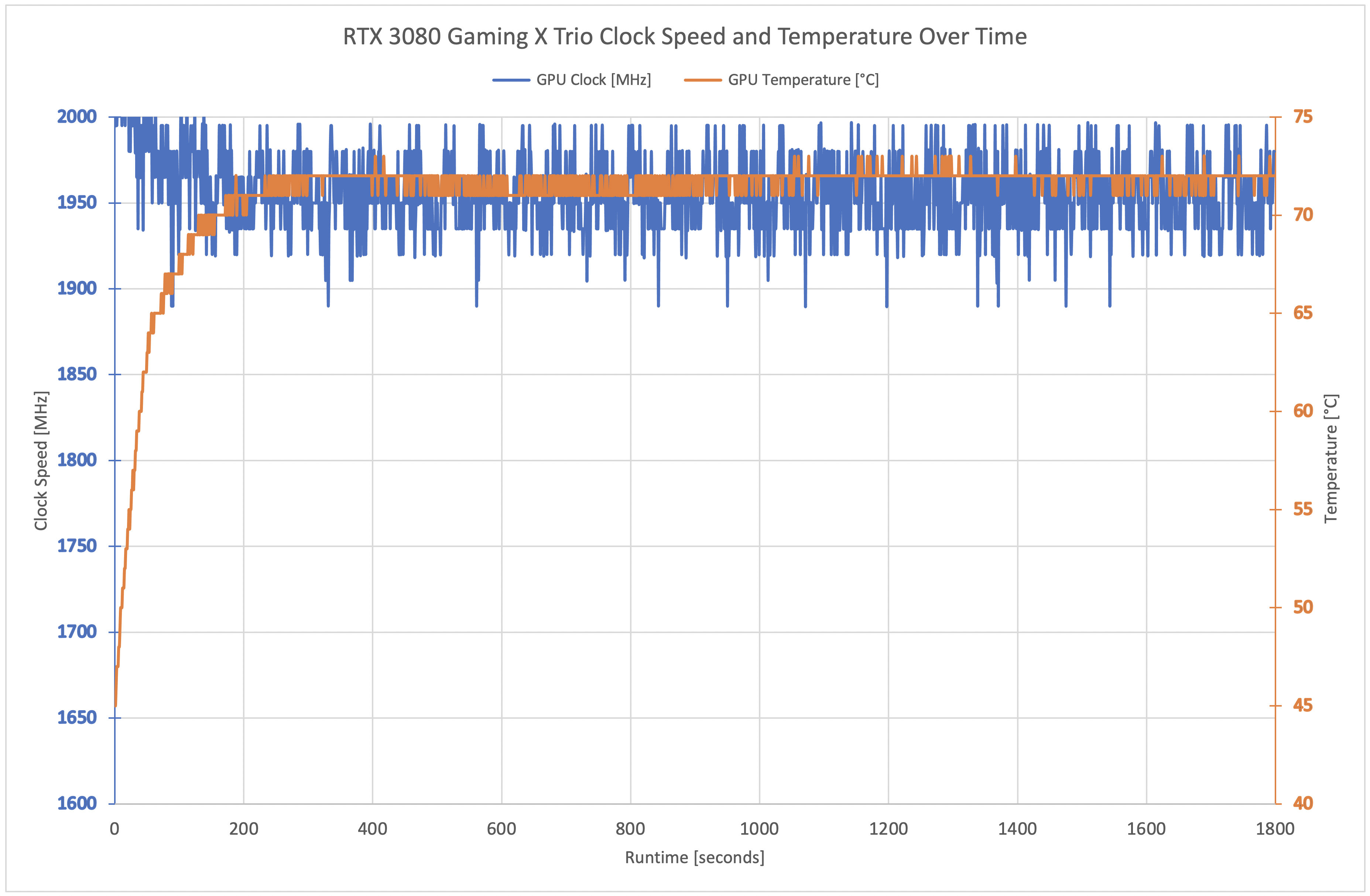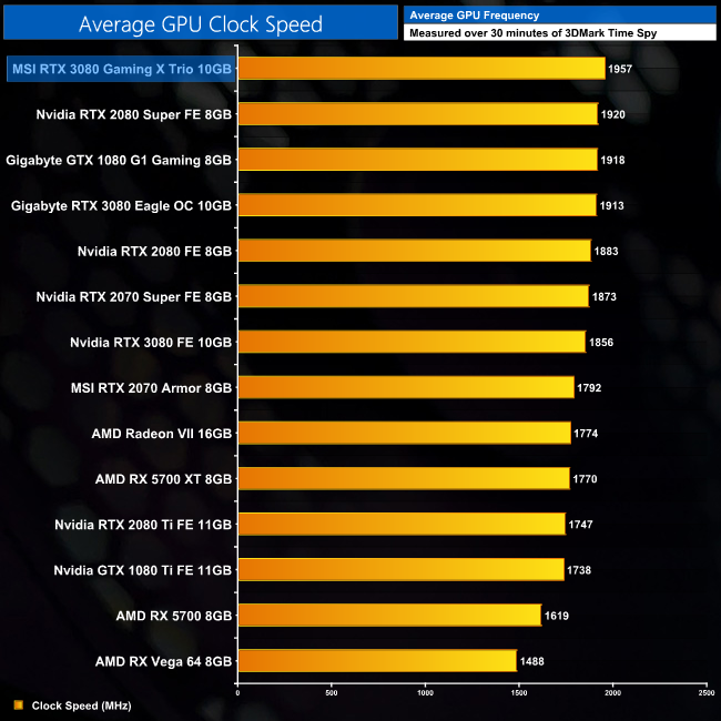 With its rated boost clock of 1815MHz, it is no surprise to see the Gaming X Trio proved about 100MHz faster than the Founders Edition, on average. It boosted as high as 2040MHz out of the box, but that sort of behaviour isn't sustainable in the long run. Even so, an average frequency of over 1950MHz is highly impressive.