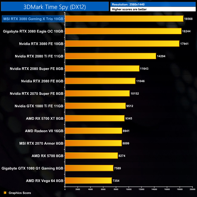 In our first 3DMark benchmarks, the performance of the Gaming X Trio is a little ahead of the Founders Edition. Its scores are 3% higher than the Founders Edition in Fire Strike and Time Spy, while that stretches to 4% in Fire Strike Ultra.