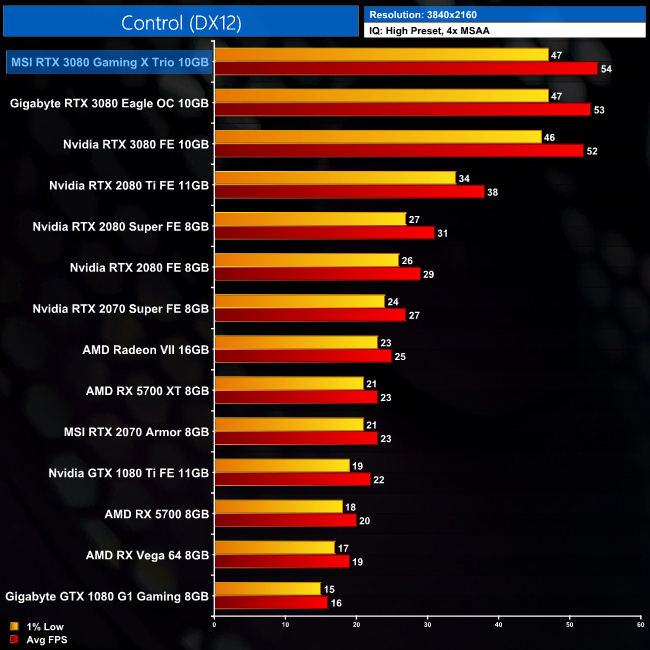 Our first game of the day is Control, and here the Gaming X Trio takes top spot at every resolution tested. At 4K, its 2FPS lead over the Founders Edition works out as a 4% performance uplift.