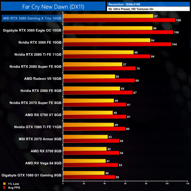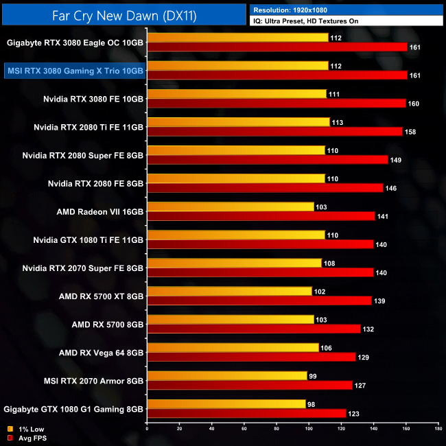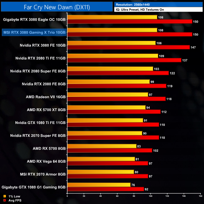Far Cry New Dawn really doesn't see any benefit from the extra frequency of the Gaming X Trio when looking at the 1080p and 1440p results, but that's because we're CPU limited at those resolutions. At 4K, the MSI card comes in 4% faster than the Founders Edition.