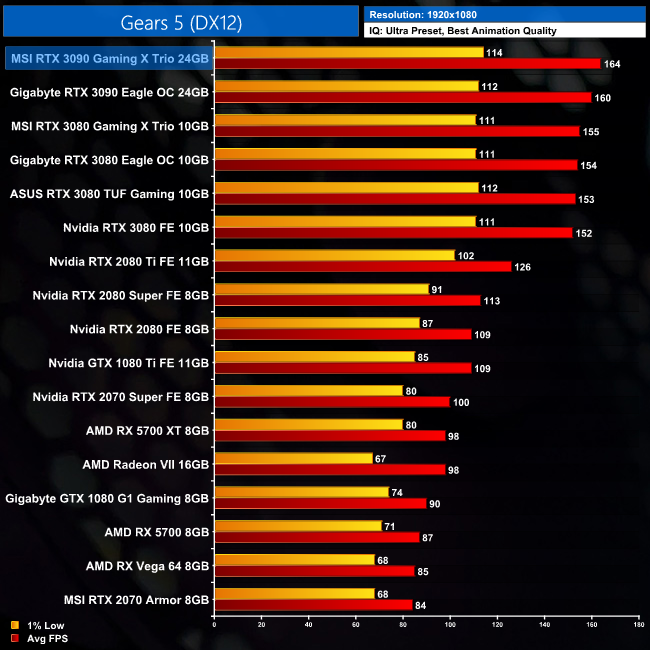 As for Gears 5, here the RTX 3090 hits 85FPS on average at 4K. This makes it 52% faster than the RTX 2080 Ti, and 13% faster than the RTX 3080 Founders Edition.
