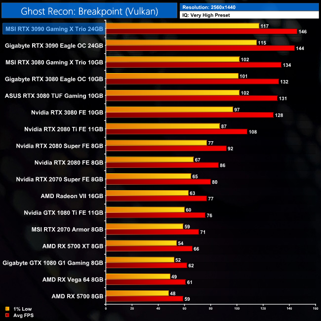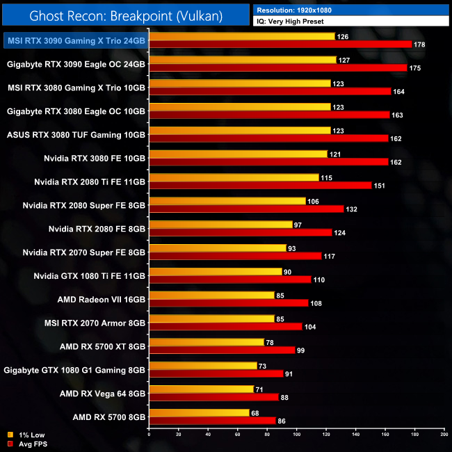 Of all the games we tested for this review, Ghost Recon: Breakpoint delivers the single biggest improvement for the RTX 3090 when compared to the RTX 3080 Founders Edition – MSI's card is 17% faster at 4K.