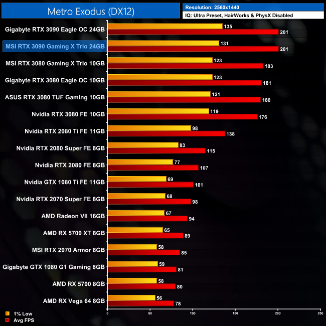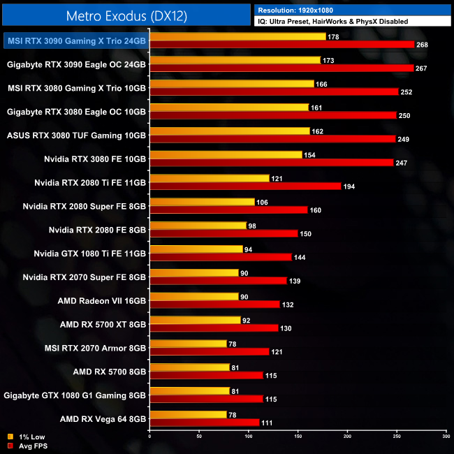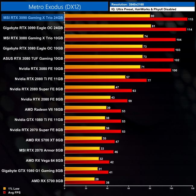 Hitting 115FPS on average, even at 4K, is no small achievement for the RTX 3090 in Metro Exodus. This puts it 15% ahead of the RTX 3080 Founders Edition.