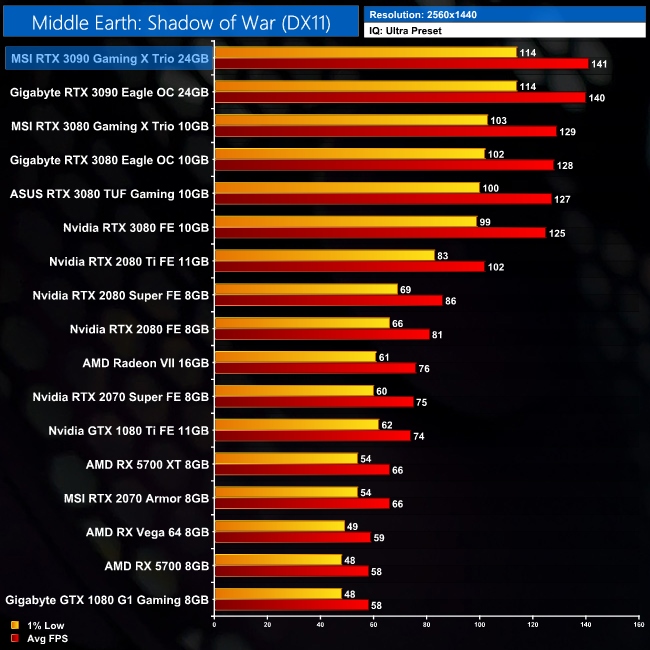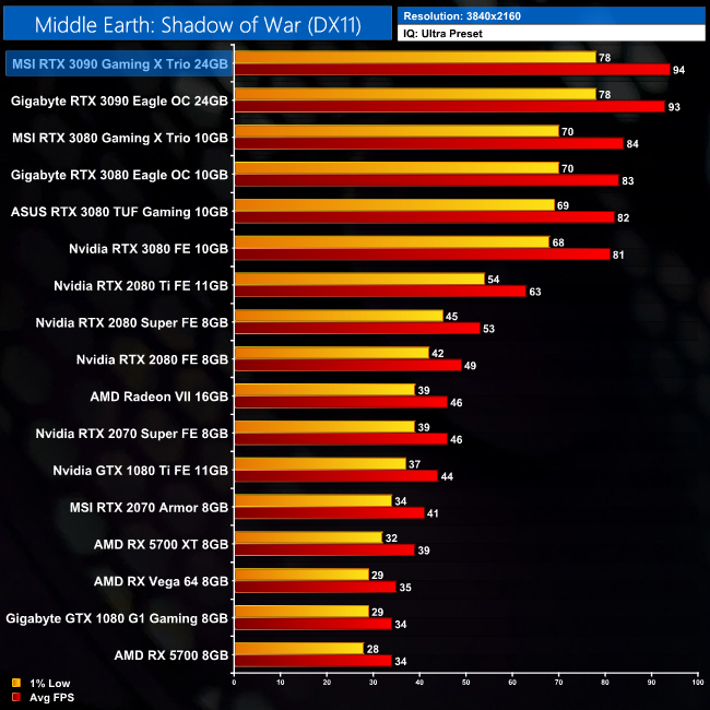 Middle Earth: Shadow of War sees frame rates come in a little short of 100FPS, but the RTX 3090 is still 16% faster than the RTX 3080, and 49% faster than the RTX 2080 Ti, in this title.