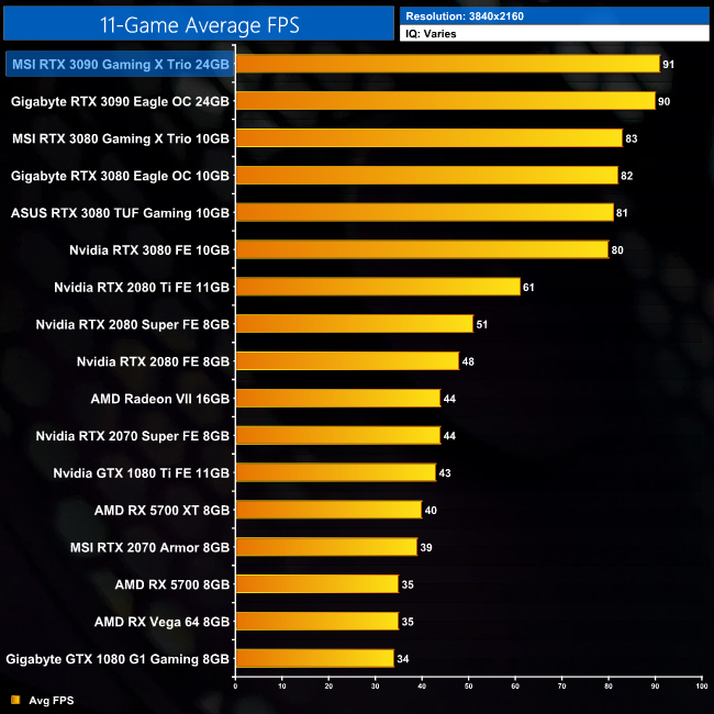 RTX 3090 does best at 4K, and we can see the MSI RTX 3090 Gaming X Trio averaged 91FPS at this resolution, across all 11 games we tested. This makes it a prime candidate for use with a high refresh rate 4K monitor. We can also see the MSI card averaged a single frame more than the Gigabyte RTX 3090 Eagle OC, thanks to its high boost clock.