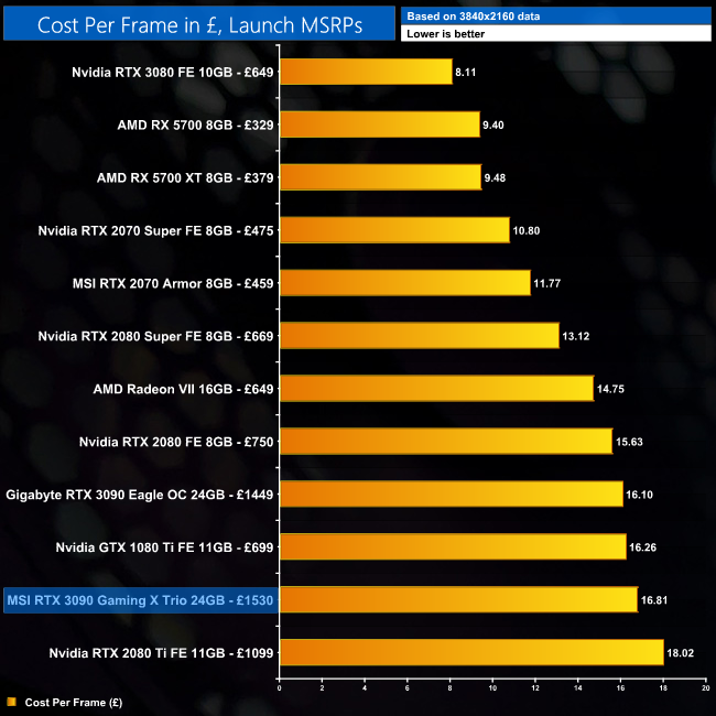 Using the average frame rate data presented on the previous page, here we look at the cost per frame using the UK MSRP launch prices for each GPU.