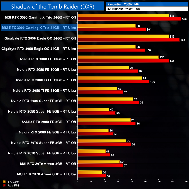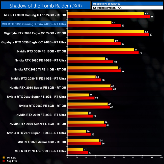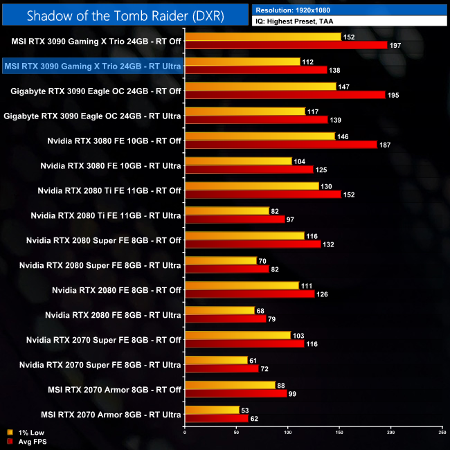 Finally, Shadow of the Tomb Raider shows another 16% lead for the MSI RTX 3090, when compared to the RTX 3080 Founders Edition. Of course, frame rates are higher with the RTX 3090, but the relative performance doesn't change when we enable ray tracing.