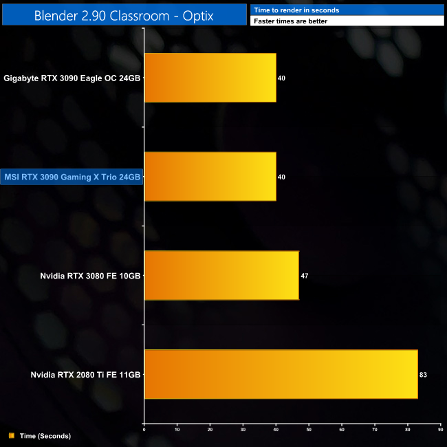 Running the same test, but with Optix instead of CUDA, drops render time to 40 seconds for the RTX 3090. However, RTX 3080 also benefits from Optix, and can render the scene in 47 seconds. This means RTX 3090 is still reducing the overall render time by the same 15% compared to RTX 3080.
