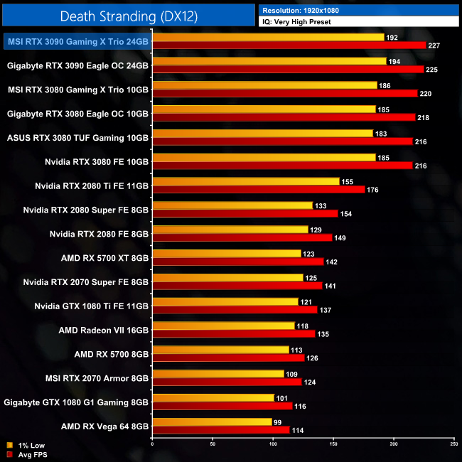 Hideo Kojima's Death Stranding is next, with RTX 3090 pushing well over 100FPS here. For the MSI Gaming X Trio, it's 14% faster than the RTX 3080 Founders Edition, and 53% faster than the RTX 2080 Ti.