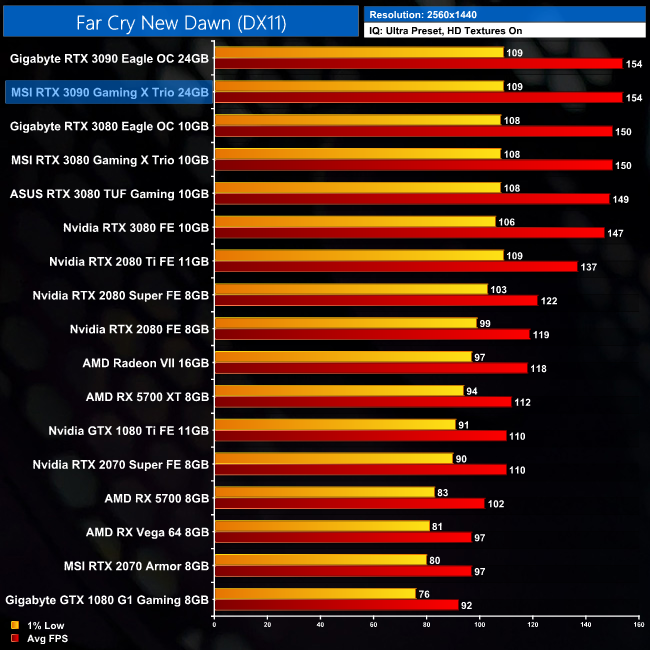 The margins tighten up somewhat in Far Cry New Dawn. Here, the MSI RTX 3090 is 38% faster than RTX 2080 Ti, and 12% faster than the RTX 3080 FE, when testing at 4K. It's still able to push almost 120FPS at this resolution, delivering a very smooth experience.