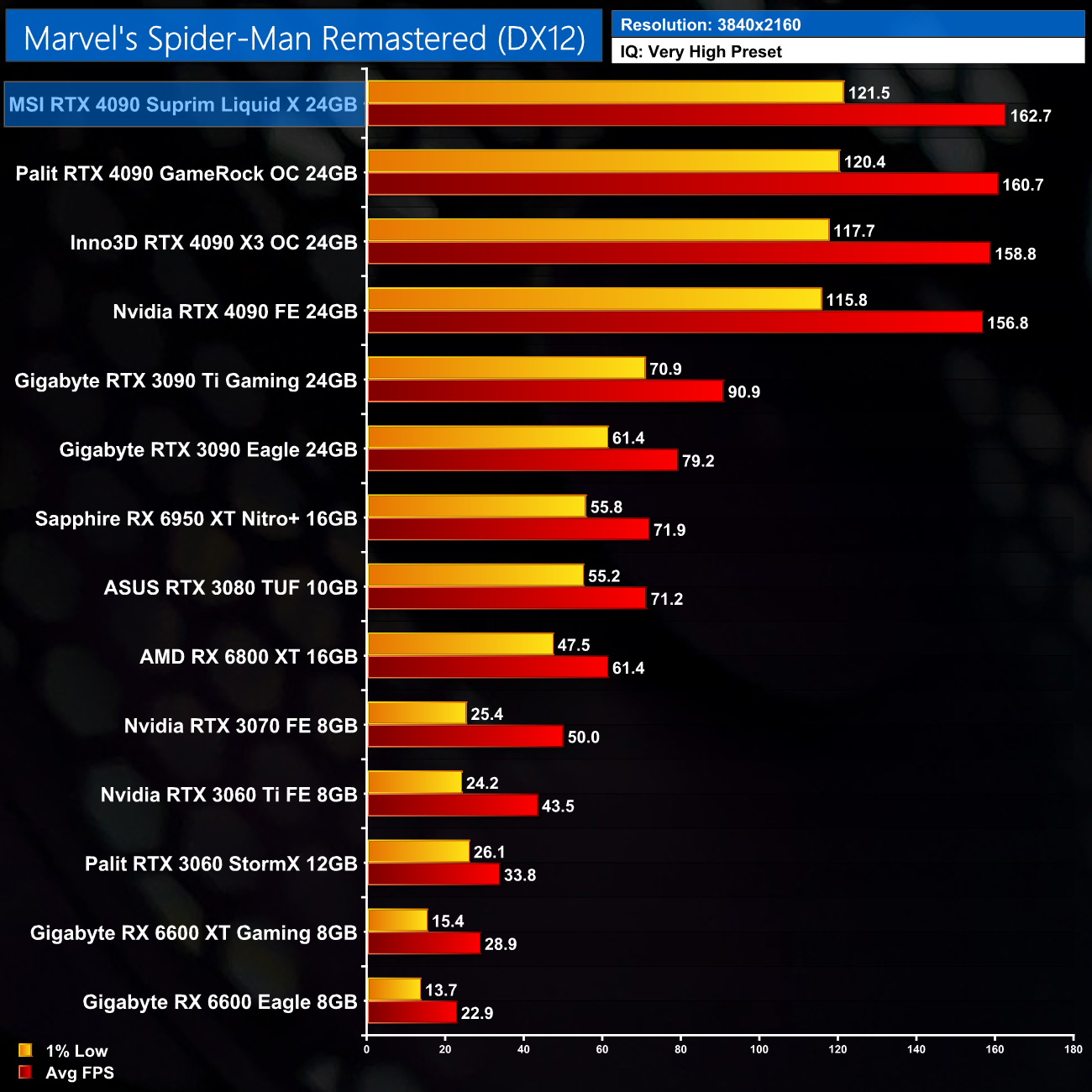 Over the 5 games we tested, the Suprim Liquid X came in at most 4% faster than the Nvidia Founders Edition, but in other scenarios, it was just 2-3% ahead. We don't focus too much on game benchmarks for the AIB reviews, as practically speaking, the differences aren't noticeable when actually gaming.
