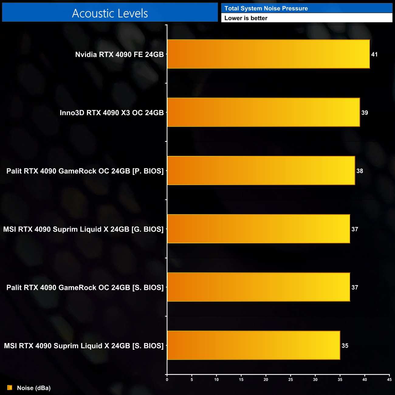 Noise levels is an area where the Suprim Liquid X does well. Using the Gaming BIOS, we saw noise levels hit 37dBa, and this dropped 2dBa using the Silent BIOS as that has a more relaxed fan curve, for both the radiator fans and the fan on the card itself, so this is definitely a key benefit to the AIO approach.