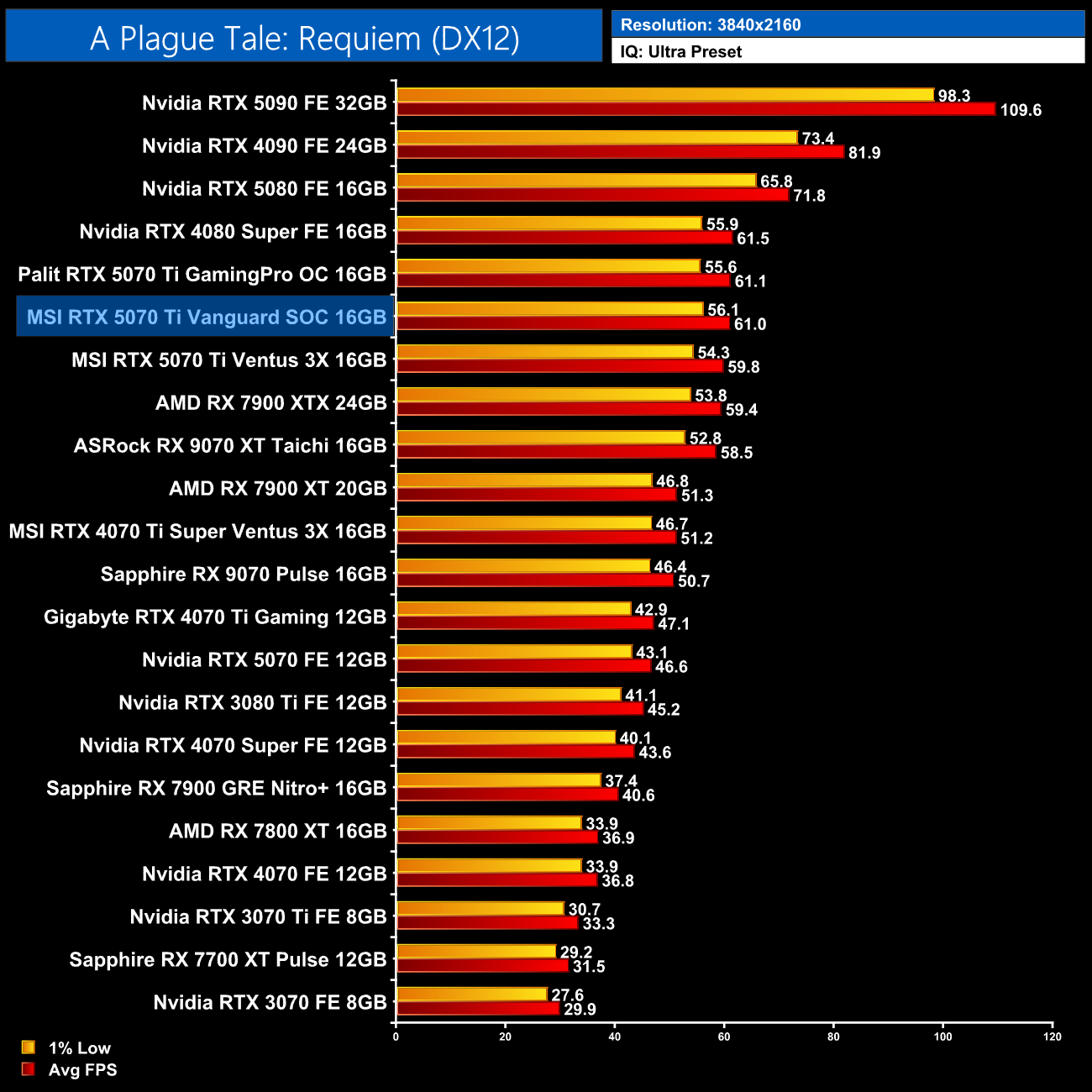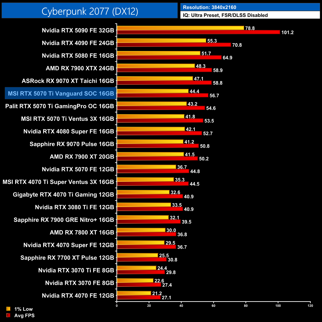 We don't focus too heavily on game benchmarks in our partner cards reviews as performance doesn't tend to change a whole lot when compared to the reference models. That was certainly the case for the Vanguard SOC – it offered an extra 3fps compared to the reference clocked MSI Ventus 3X model in Cyberpunk 2077, but barely improved the frame rate in the other two games tested.