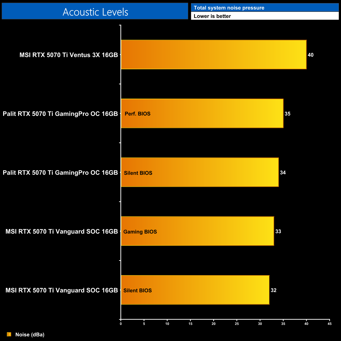 Likewise, the Vanguard SOC is incredibly quiet. When using the Silent BIOS, the fans spun at just 31%/1040rpm, proving to be effectively inaudible in my testing. The Gaming BIOS was barely any louder, running at 35%/1130rpm, and that only registered at 33dBa on my sound meter. Safe to say, you won't be hearing this card over any case fans.