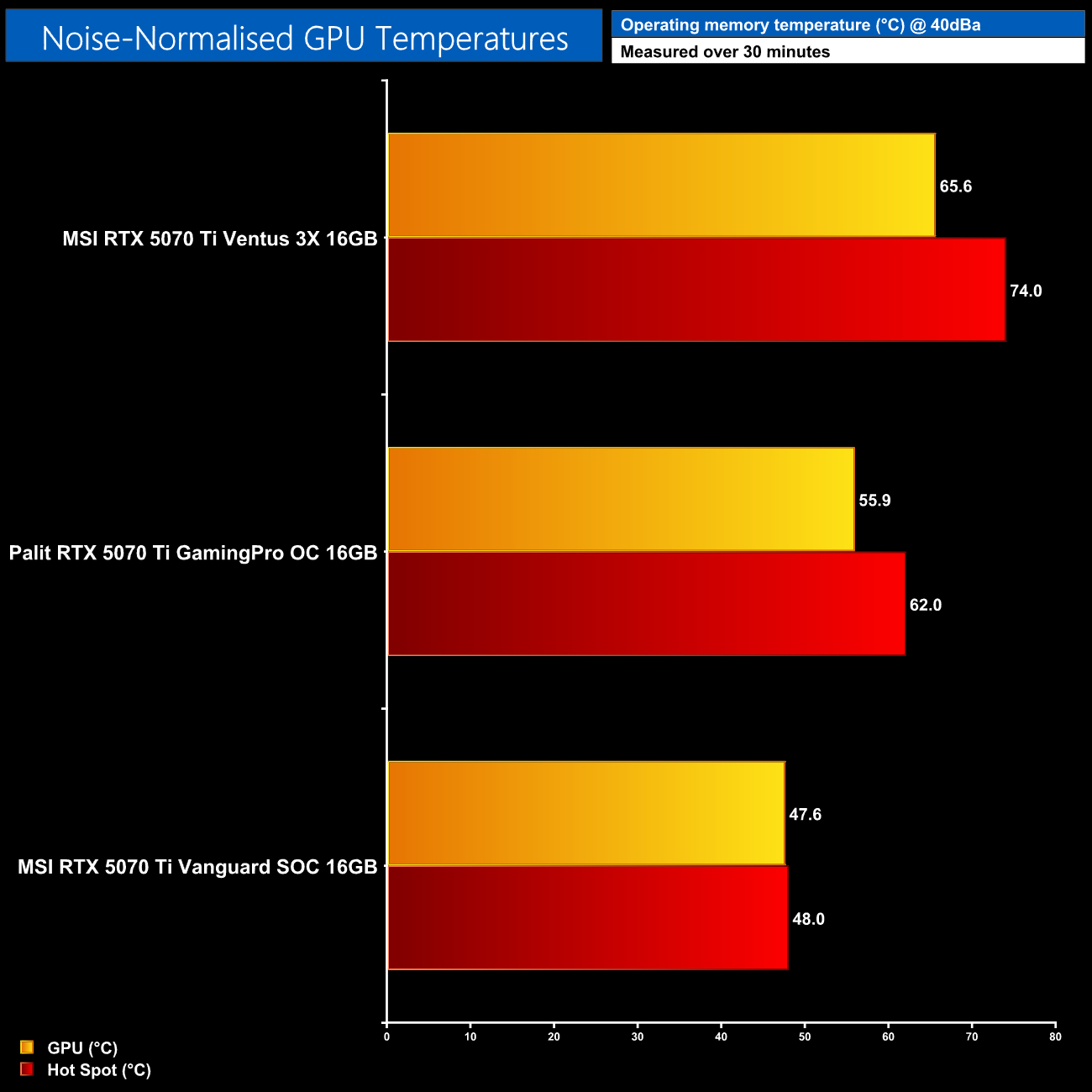 Following on from our stock thermal and acoustic testing, here we re-test the operating temperature of the GPU, but with noise levels normalised to 40dBa. This allows us to measure the efficiency of the overall cooling solution as varying noise levels as a result of more aggressive fan curves are no longer a factor.