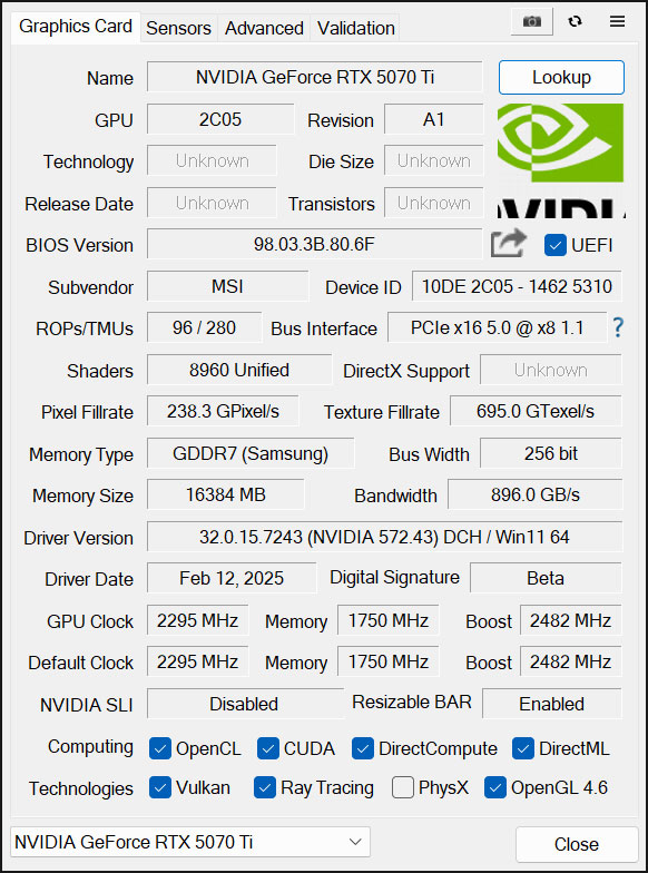 First, a quick spec recap. Whereas the RTX 5080 is a full implementation of the GB203 die (378mm2), RTX 5070 Ti is cut down across the board. Comprised of six Graphics Processing Clusters (GPCs), each holds up to eight Texture Processing Clusters (TPCs), with a total of 35. Each TPC is home to two Streaming Multiprocessors (SMs), giving us 84, and each SM still holds 128 CUDA Cores, meaning the RTX 5070 Ti has a total of 8960 shaders. We also find 70 RT cores, 280 Tensor cores, 280 Texture Units, and 96 ROPs.