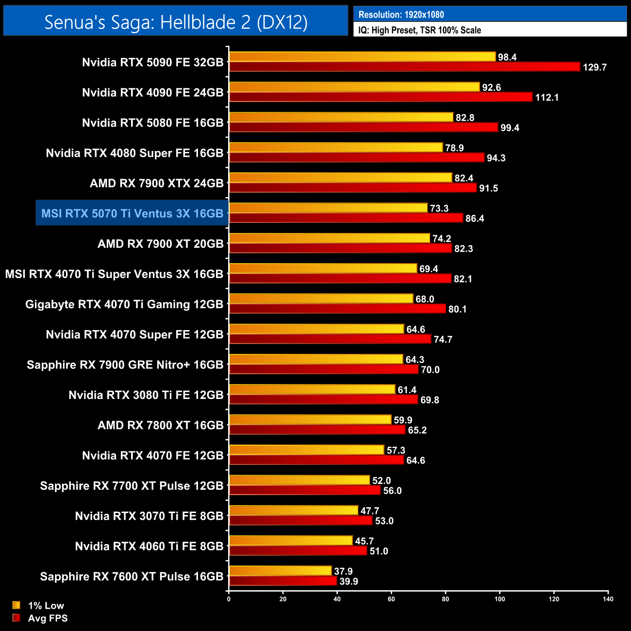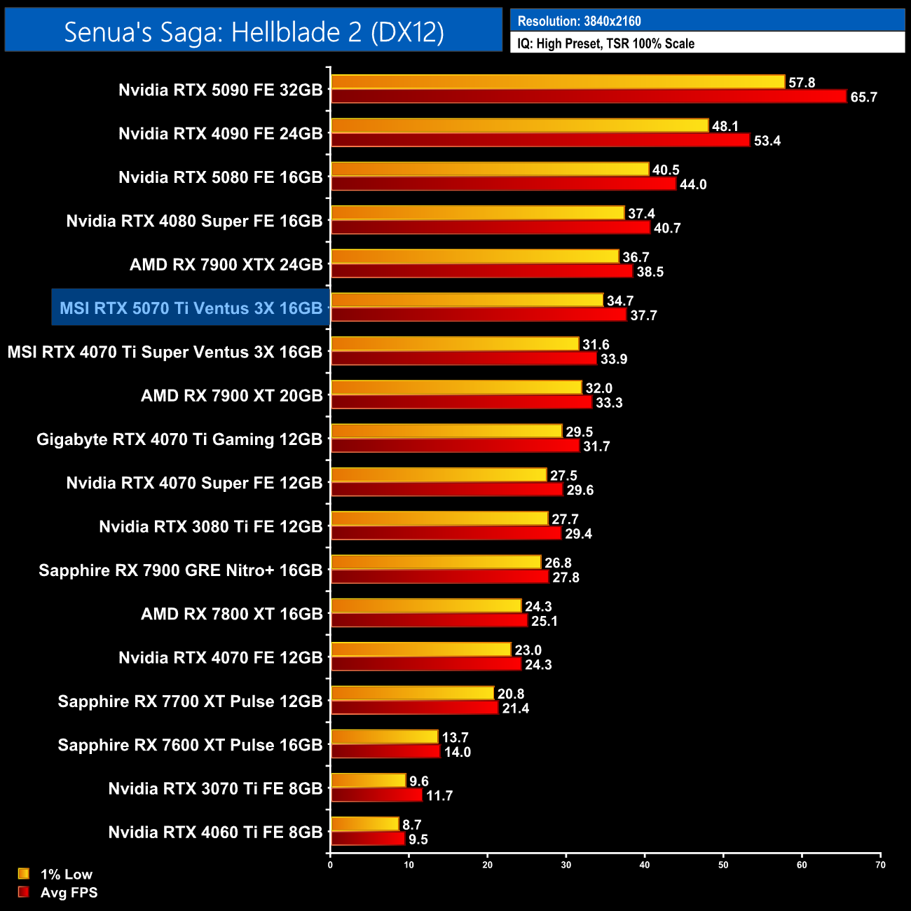 As for Senua's Saga: Hellblade 2, here the 5070 Ti delivers 64fps at 1440p, making it 8% faster than the 4070 Ti Super and just 4% slower than the 7900 XTX.