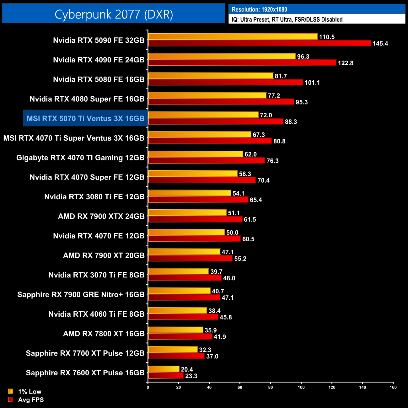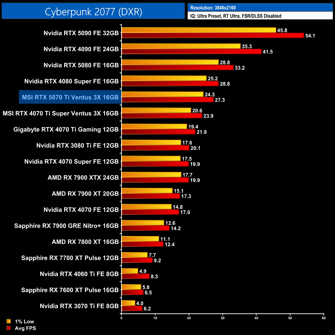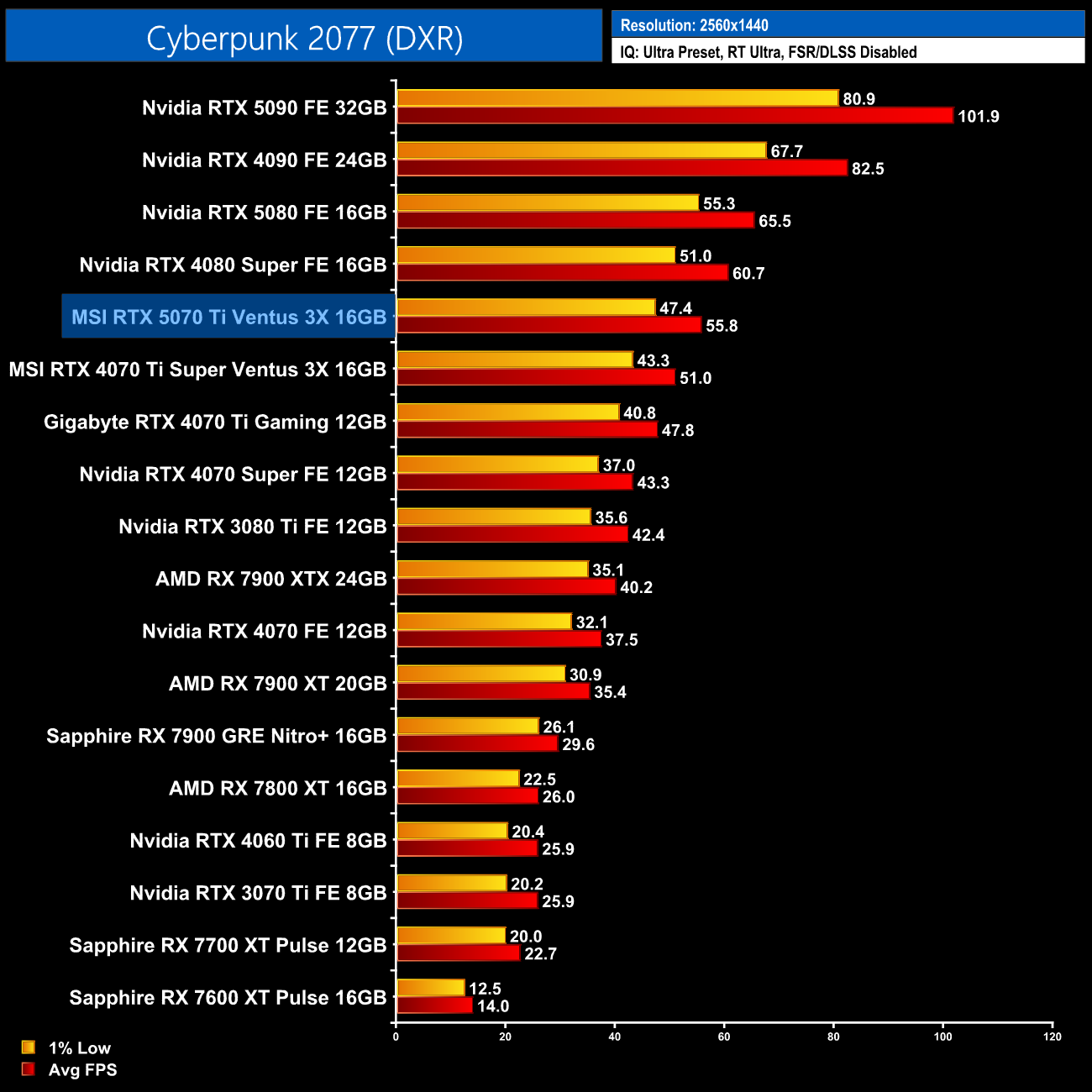 As for Cyberpunk, at 1440p the RTX 5070 Ti manages 56fps, giving it a 9% boost over the RTX 4070 Ti Super.