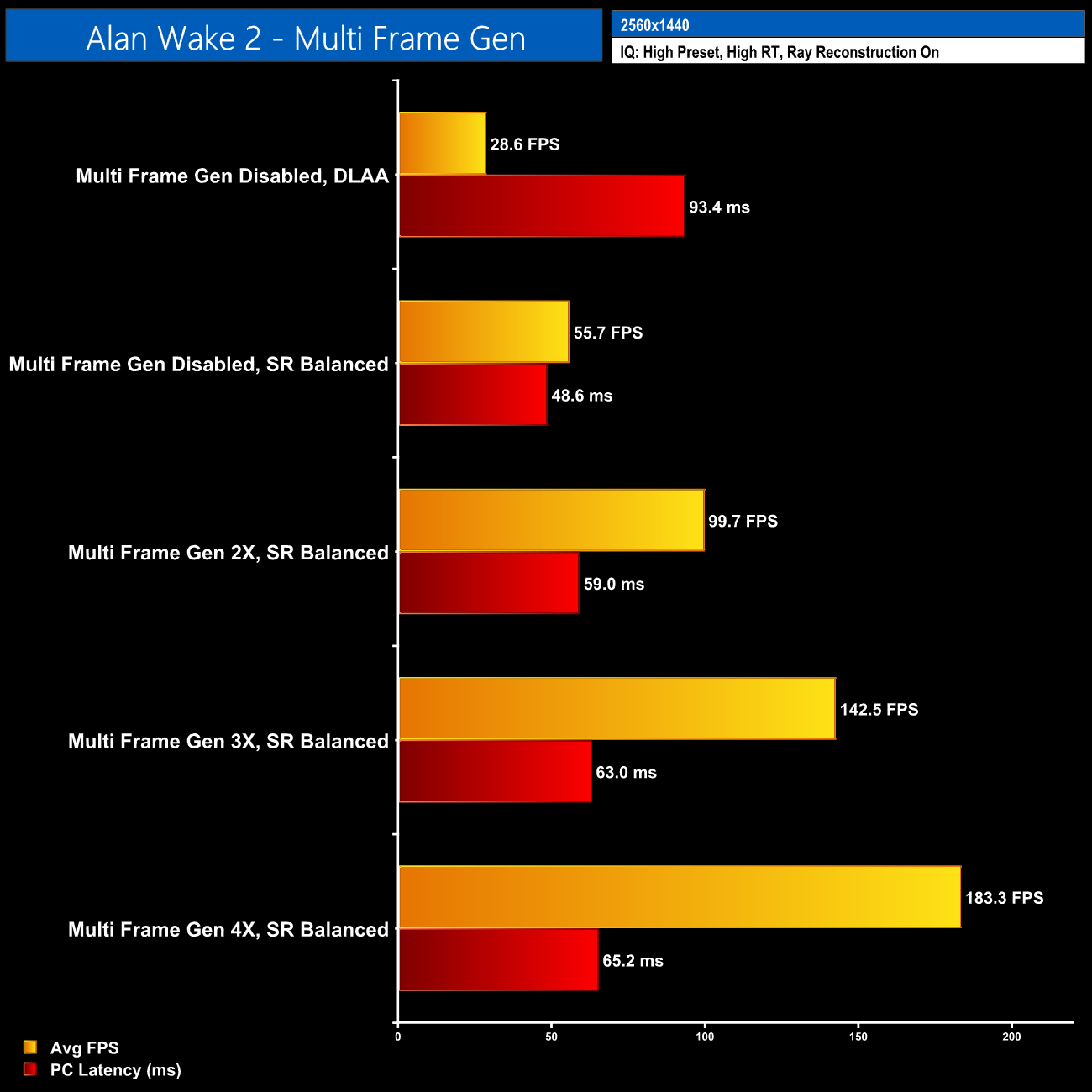 Drop to 1440p, however, and the 5070 Ti can do 67fps baseline when using Super Resolution Balanced mode, so latency has a much lower starting point, and as such only tops out at 44ms when using MFG 4X. It's still not perfect, as we pointed out in our RTX 5090 review – traditionally, latency should go down as frame rate increases, not up, but it's worth keeping in mind.