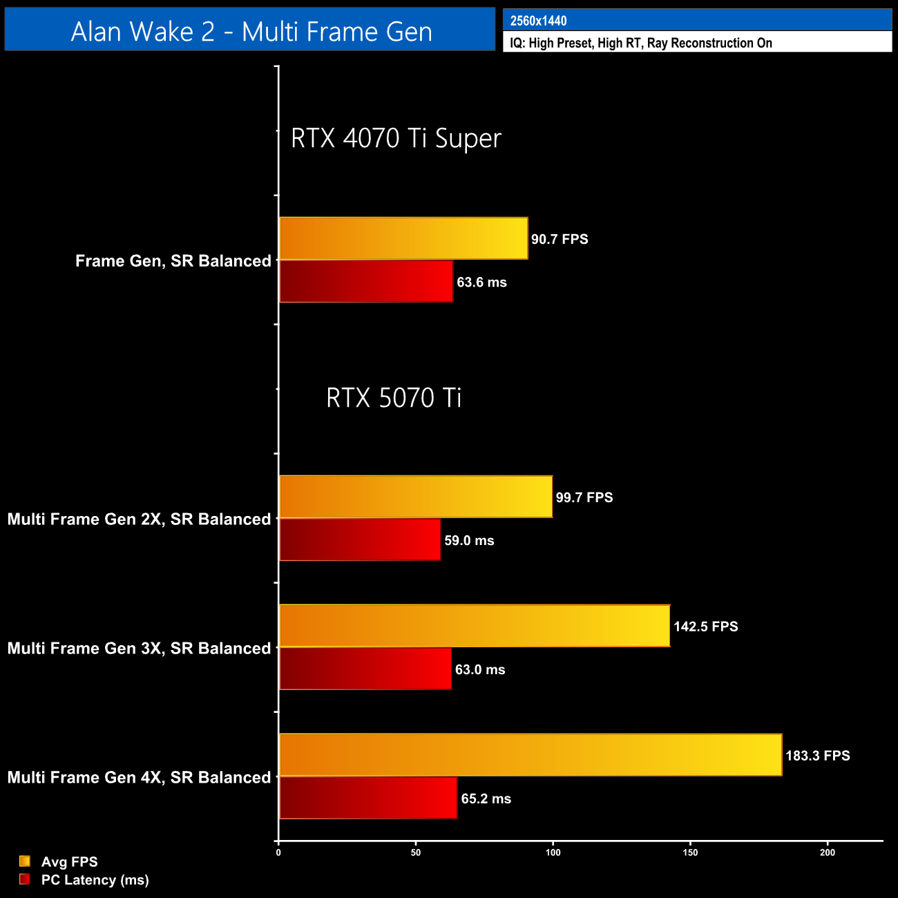 The first thing to point out is that the experience using MFG at 4K isn't nearly as satisfactory as we saw from the RTX 5080 and RTX 5090, and that's for one simple reason – the base frame rate is considerably lower. That impacts latency, as if the 5070 Ti can only hit 30-40fps before MFG is enabled, latency will only get worse once the various frame gen settings are enabled.