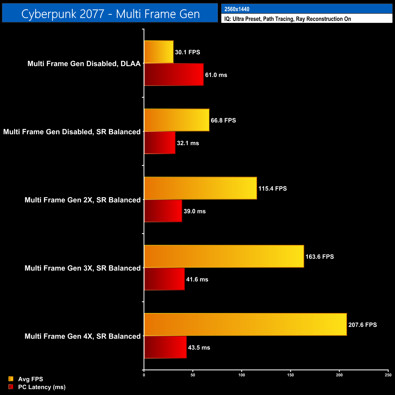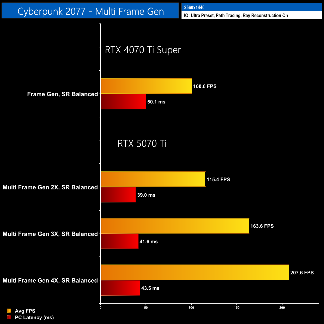 We can see the same in Cyberpunk 2077 – at 4K, when only using Super Resolution Performance mode at 4K, the 5070 Ti delivers 45fps baseline. Whacking on MFG will give frame rates hitting up to 144fps when using MFG 4X, but the latency is approaching 60ms in that instance.