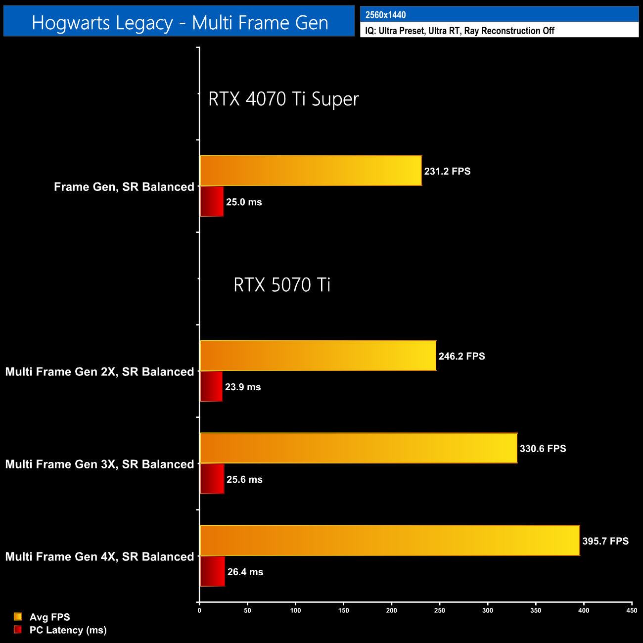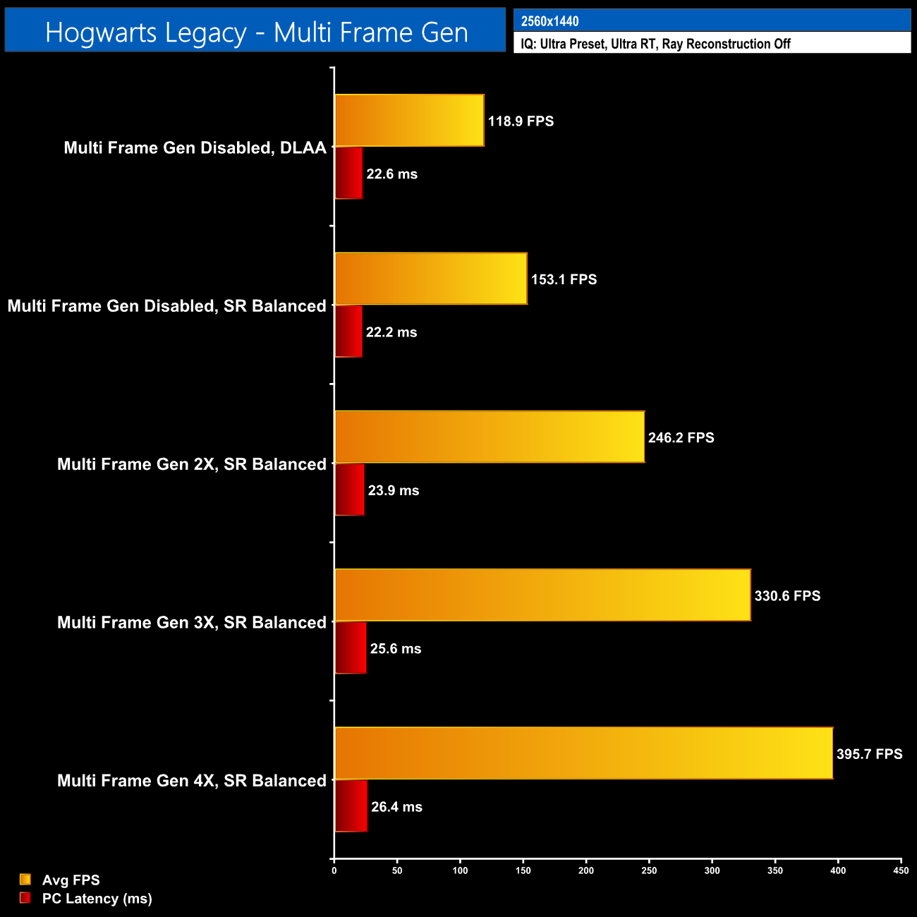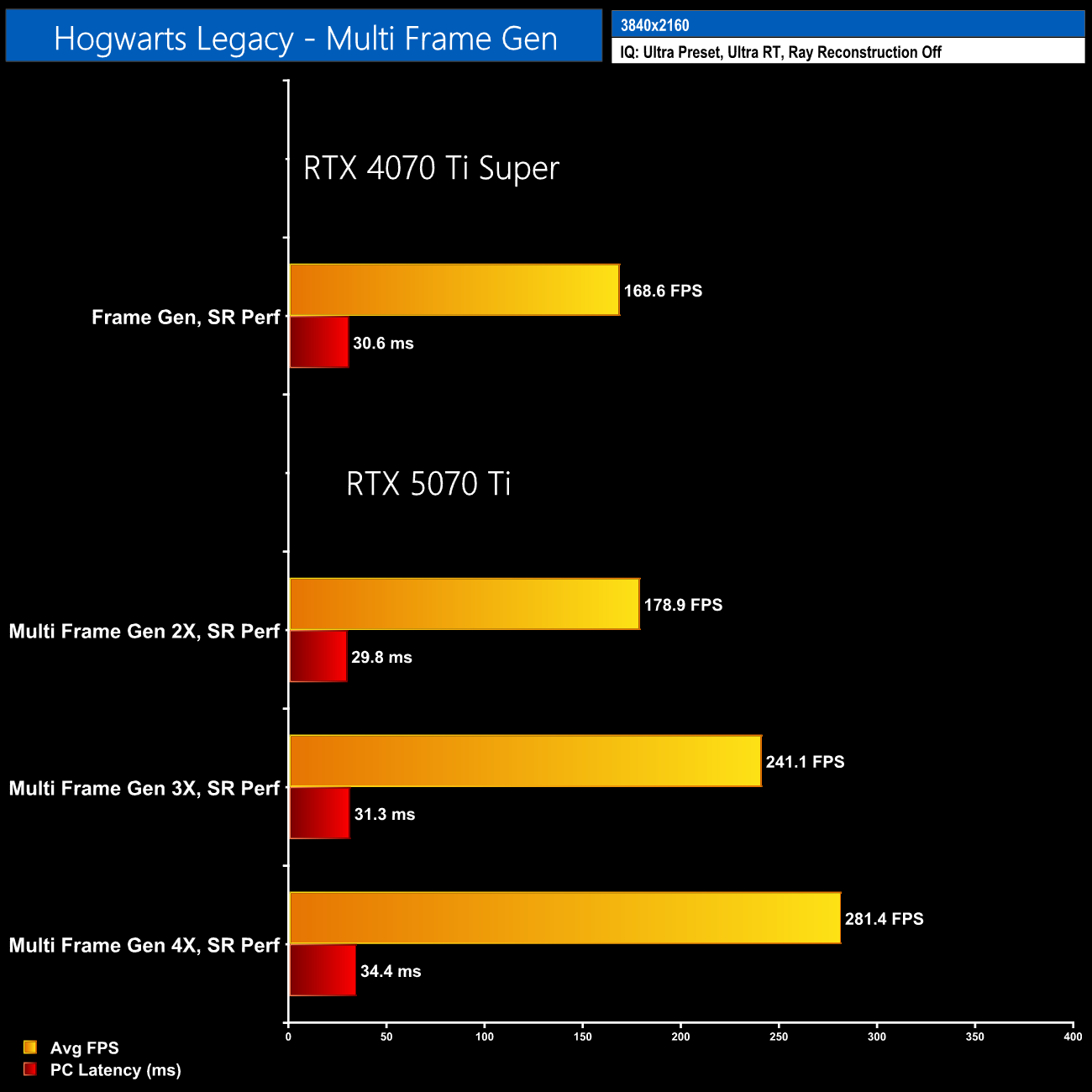 Of course, some games are easier to run than others, and Hogwarts Legacy is no problem to use at 4K with MFG, given the frame rate is already at 120fps when only using Super Resolution Performance mode – as such, the latency hit to MFG isn't so noticeable, topping out at 34ms, while frame rates hit 281fps on average.