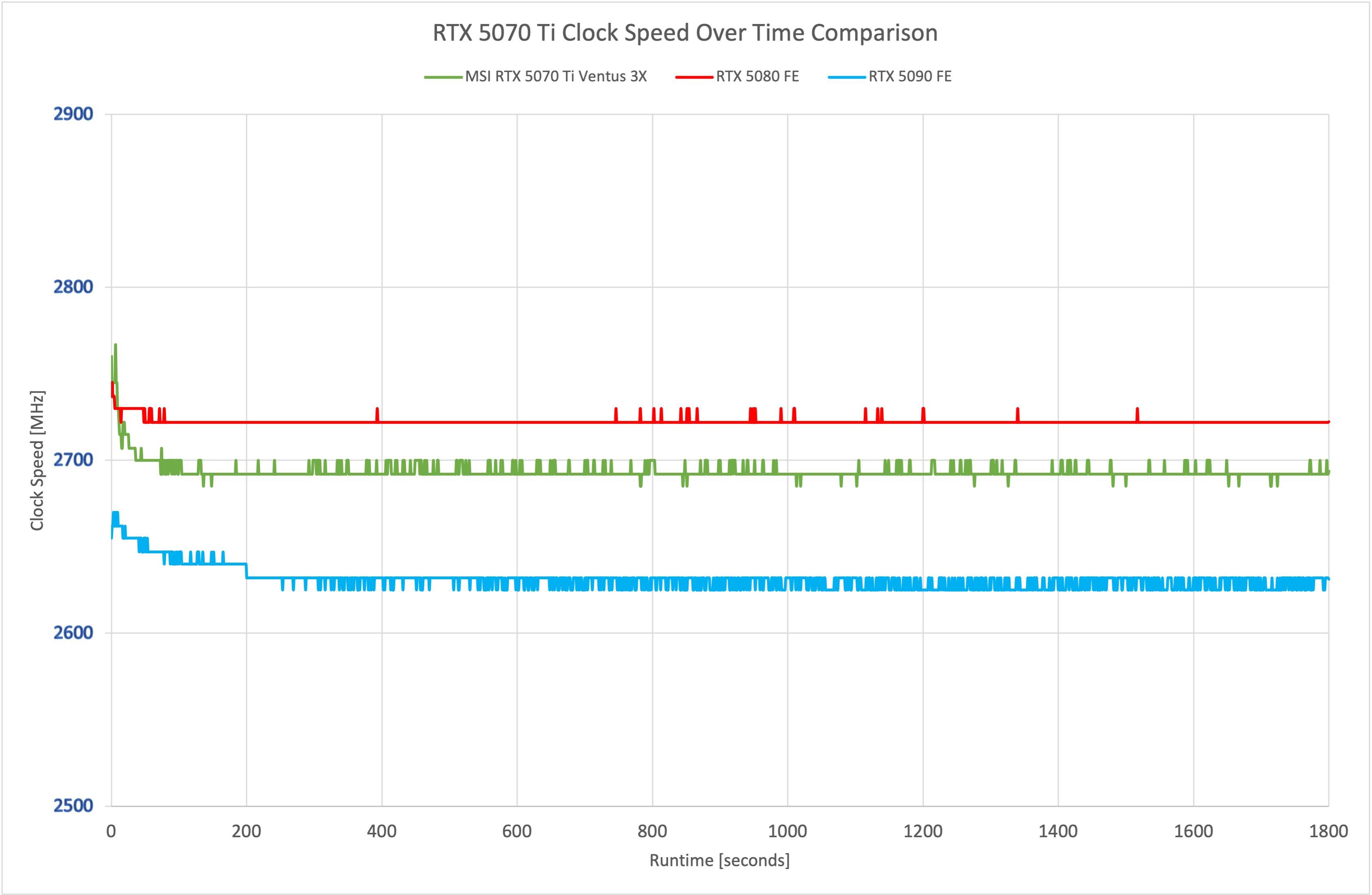 Over our thirty minute stress test, the 5070 Ti averaged 2694MHz, roughly 30MHz lower than the 5080. It'll be interesting to see how far Nvidia's partners can push this with their factory OC boards.
