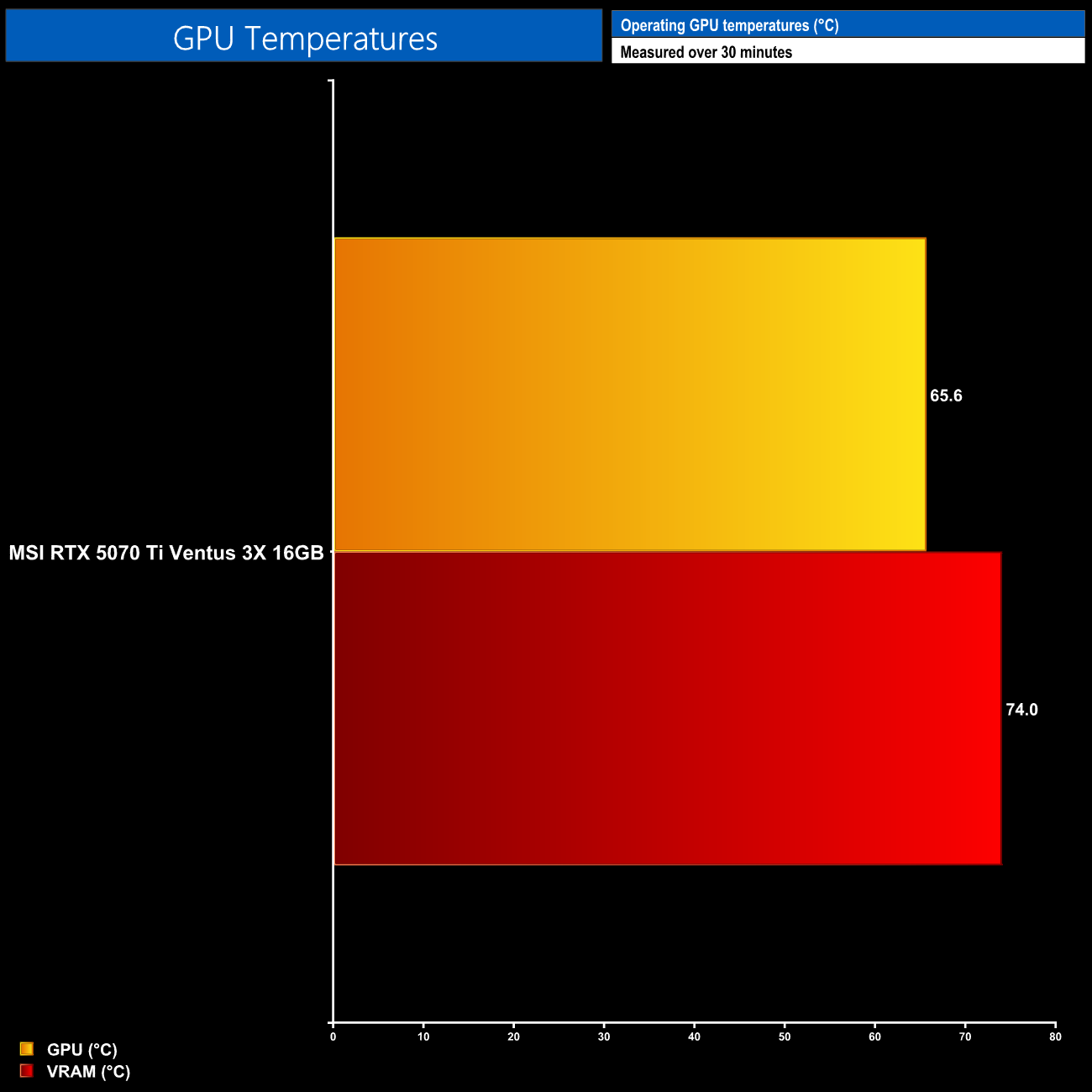 We don’t yet have comparisons for thermal performance, but the Ventus 3X delivers decent results out of the box, hitting just under 66C on the GPU and 74C on the memory.