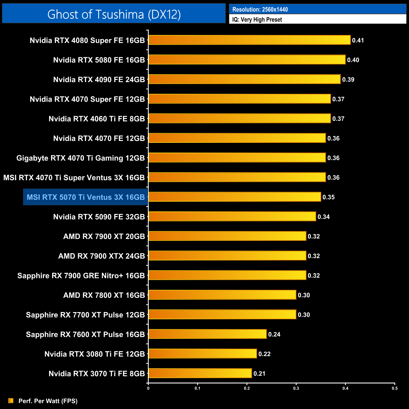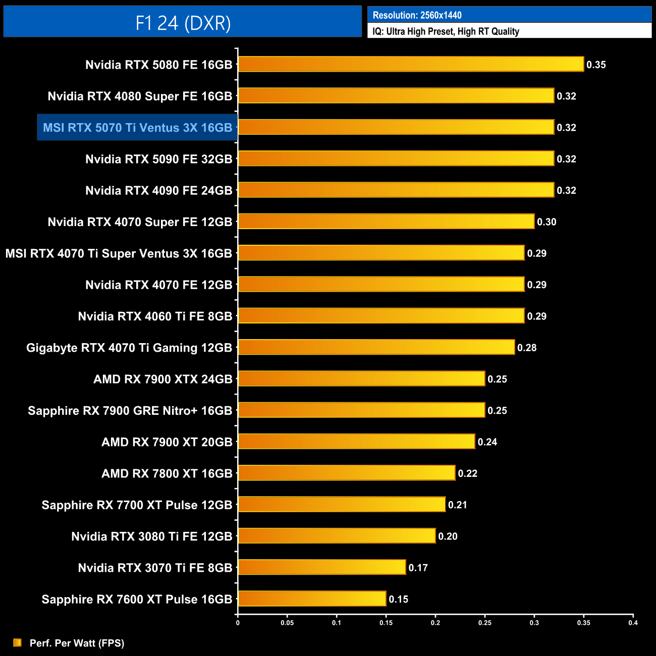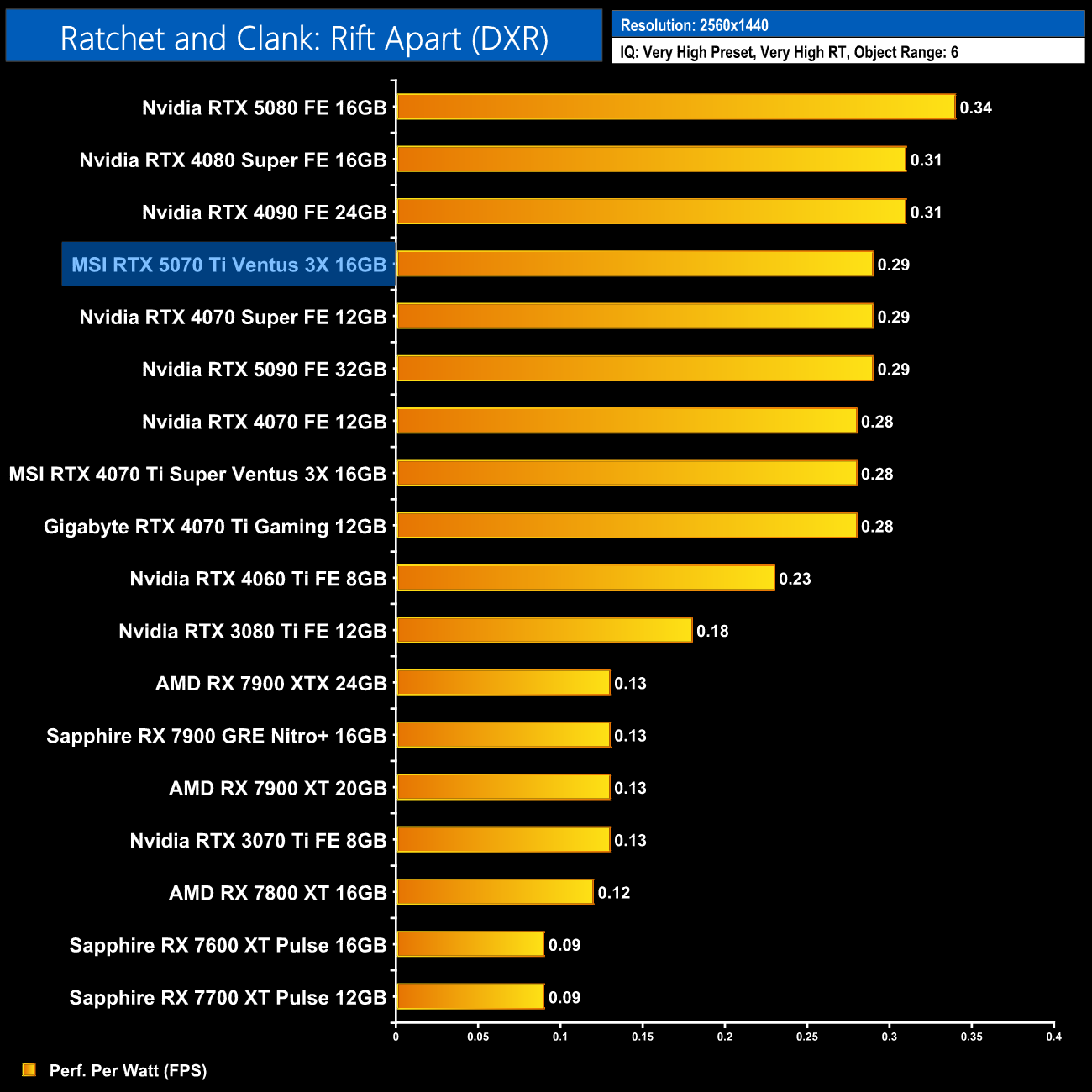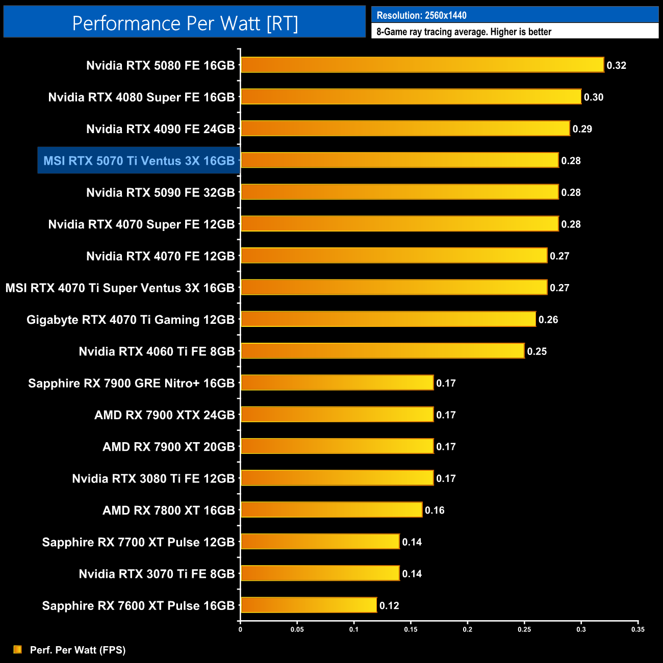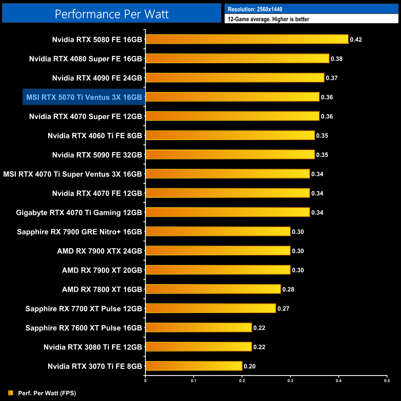 Efficiency at 1440p sees the RTX 5070 Ti deliver performance per Watt that is 14% lower than the RTX 5080.