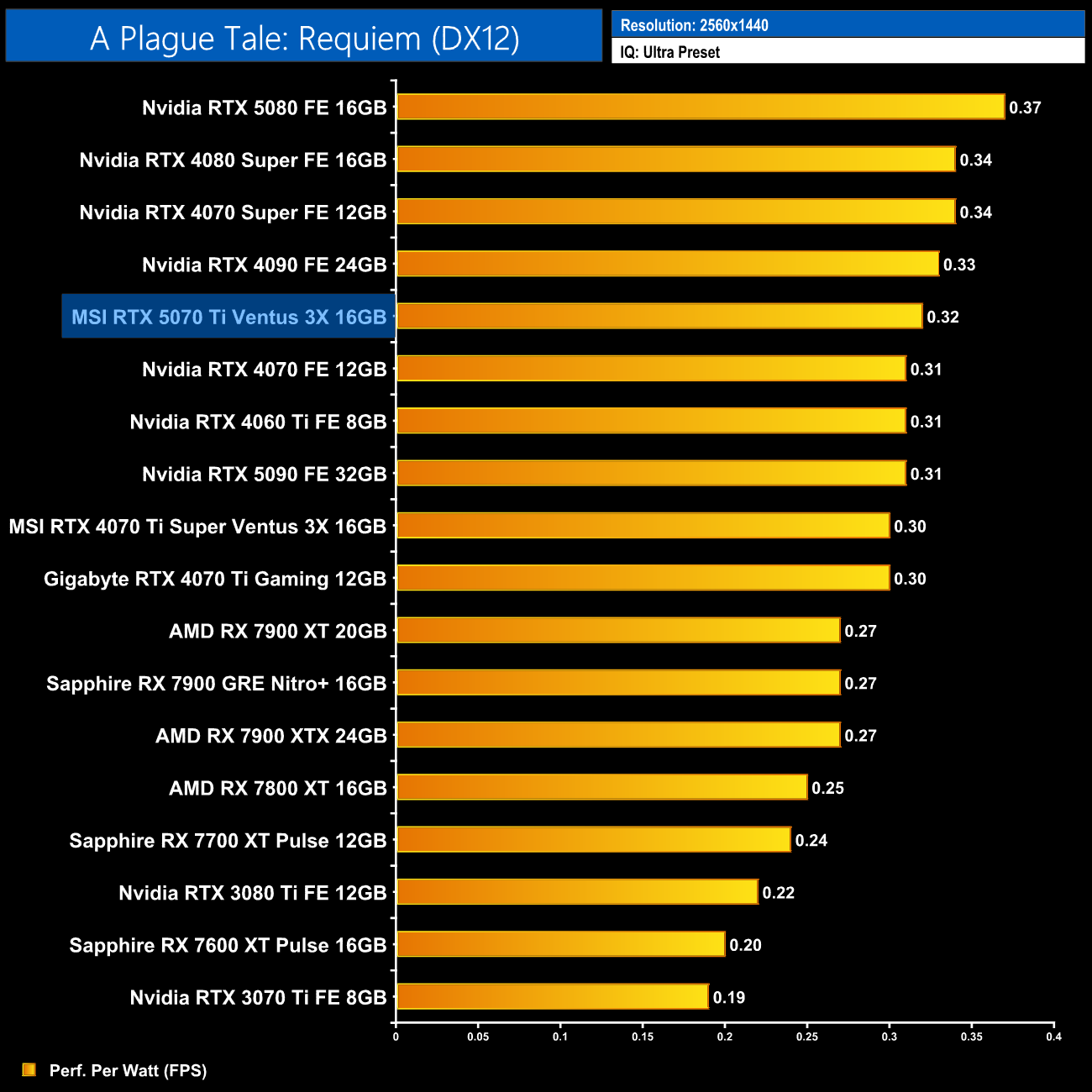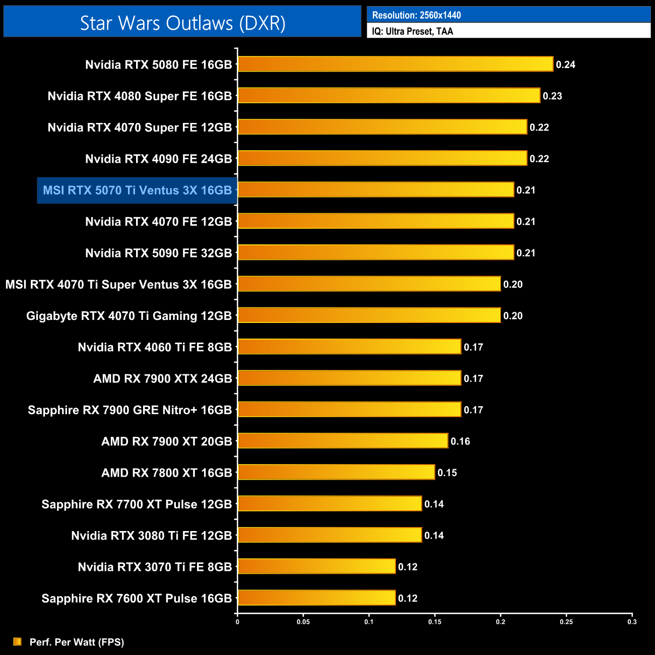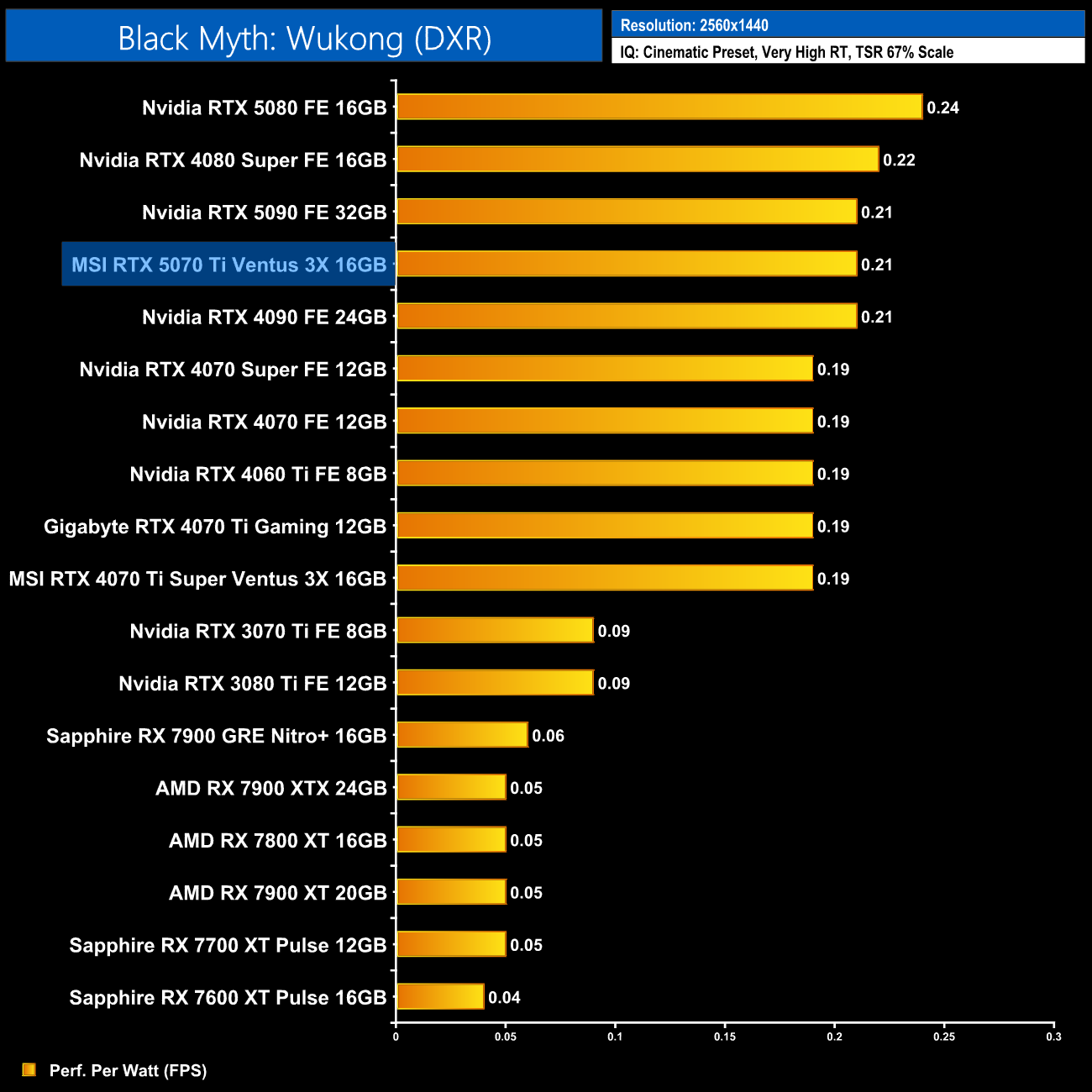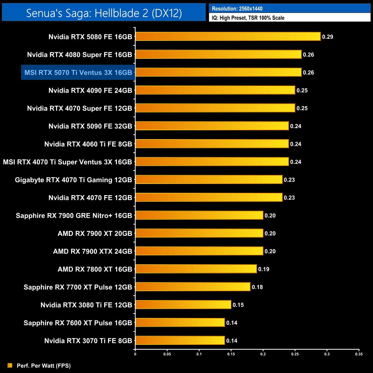 Efficiency at 1440p sees the RTX 5070 Ti deliver performance per Watt that is 14% lower than the RTX 5080.