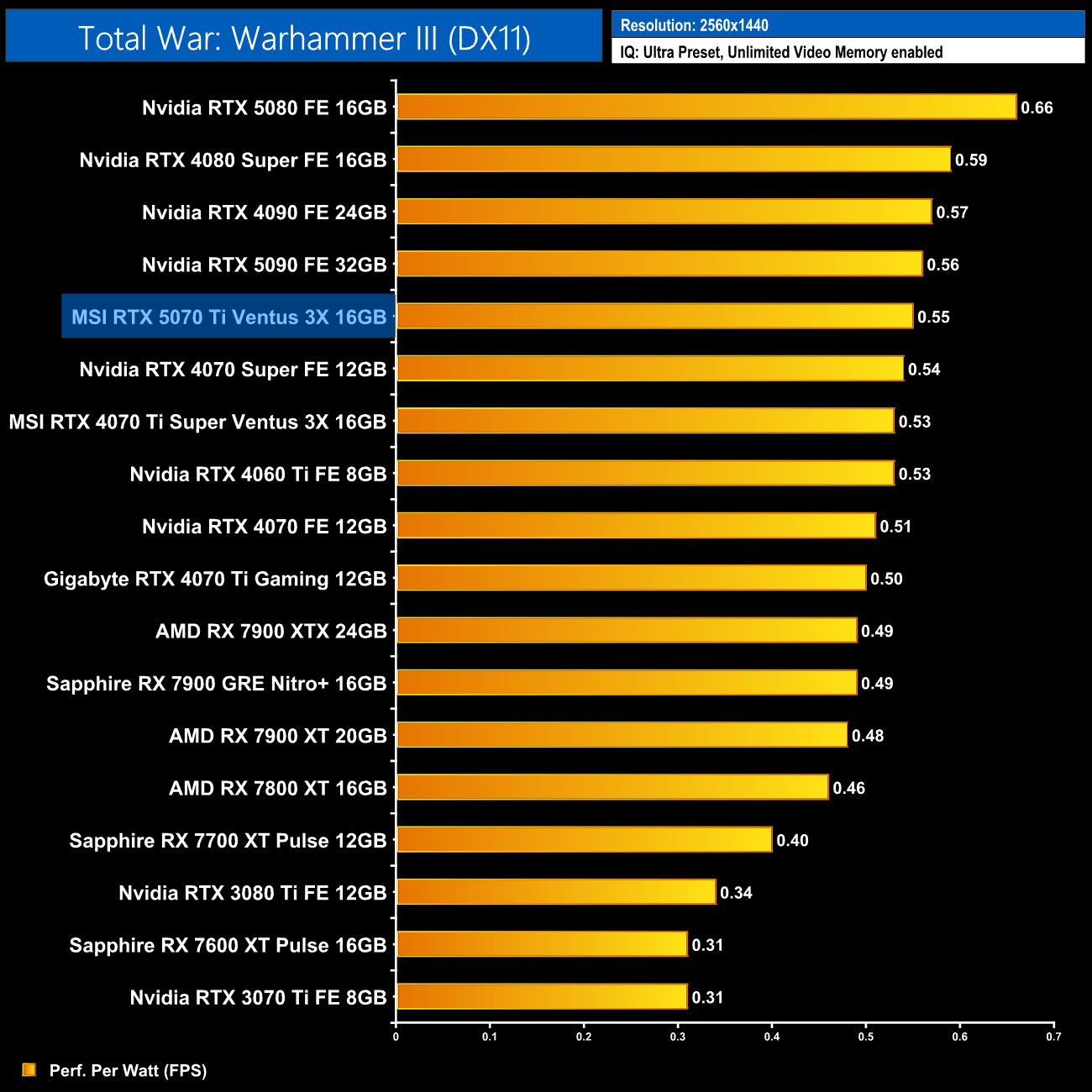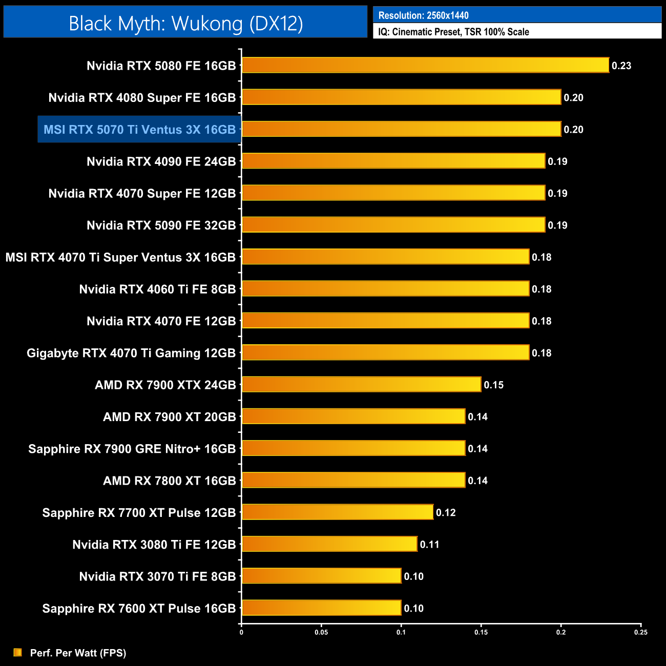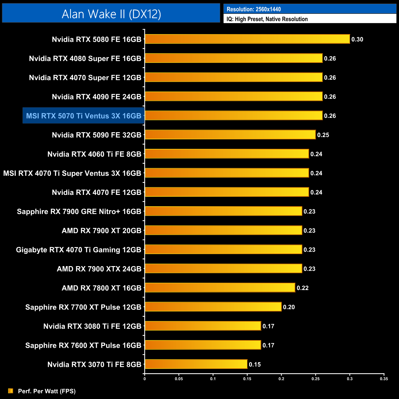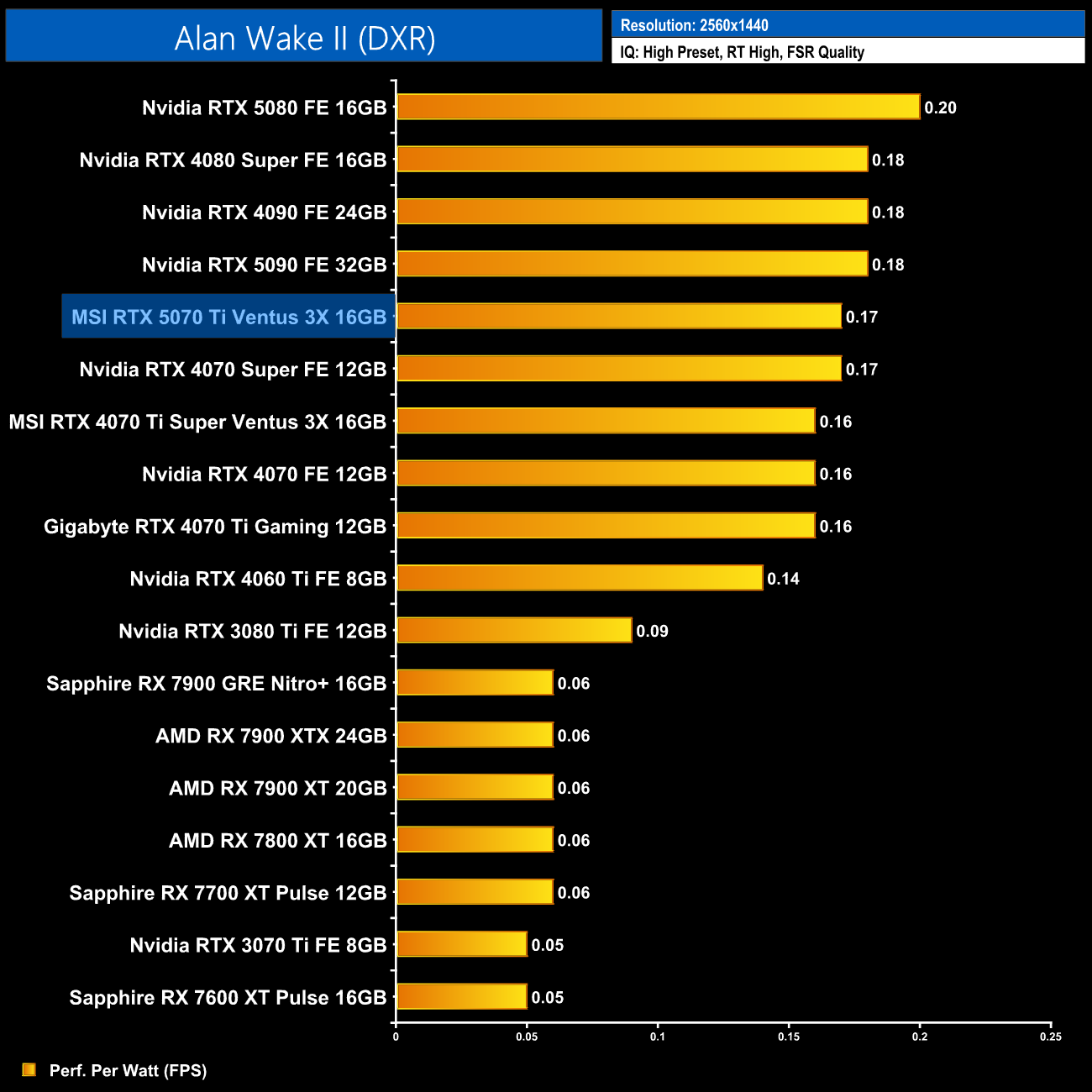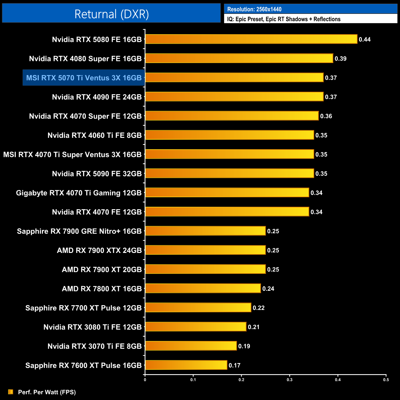 Efficiency at 1440p sees the RTX 5070 Ti deliver performance per Watt that is 14% lower than the RTX 5080.